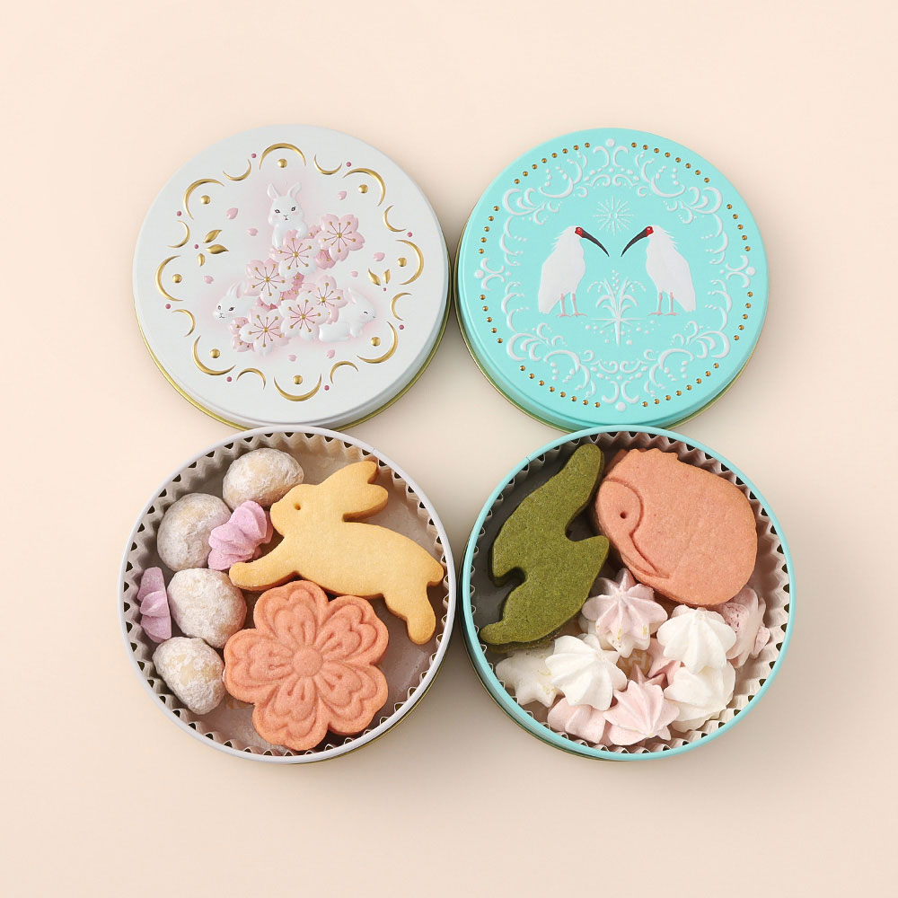 「桜とうさぎ缶」:佐渡島の固有種のサドノウサギと桜をデザインした缶に、愛らしいうさぎのクッキー・桜クッキー・メレンゲ菓子・ブールドネージュ入り。「朱鷺缶」:佐渡島の豊かな自然の下、人と共生する鳥、朱鷺の缶に、米粉入りクッキー・抹茶クッキー・紅白のメレンゲ菓子入り。