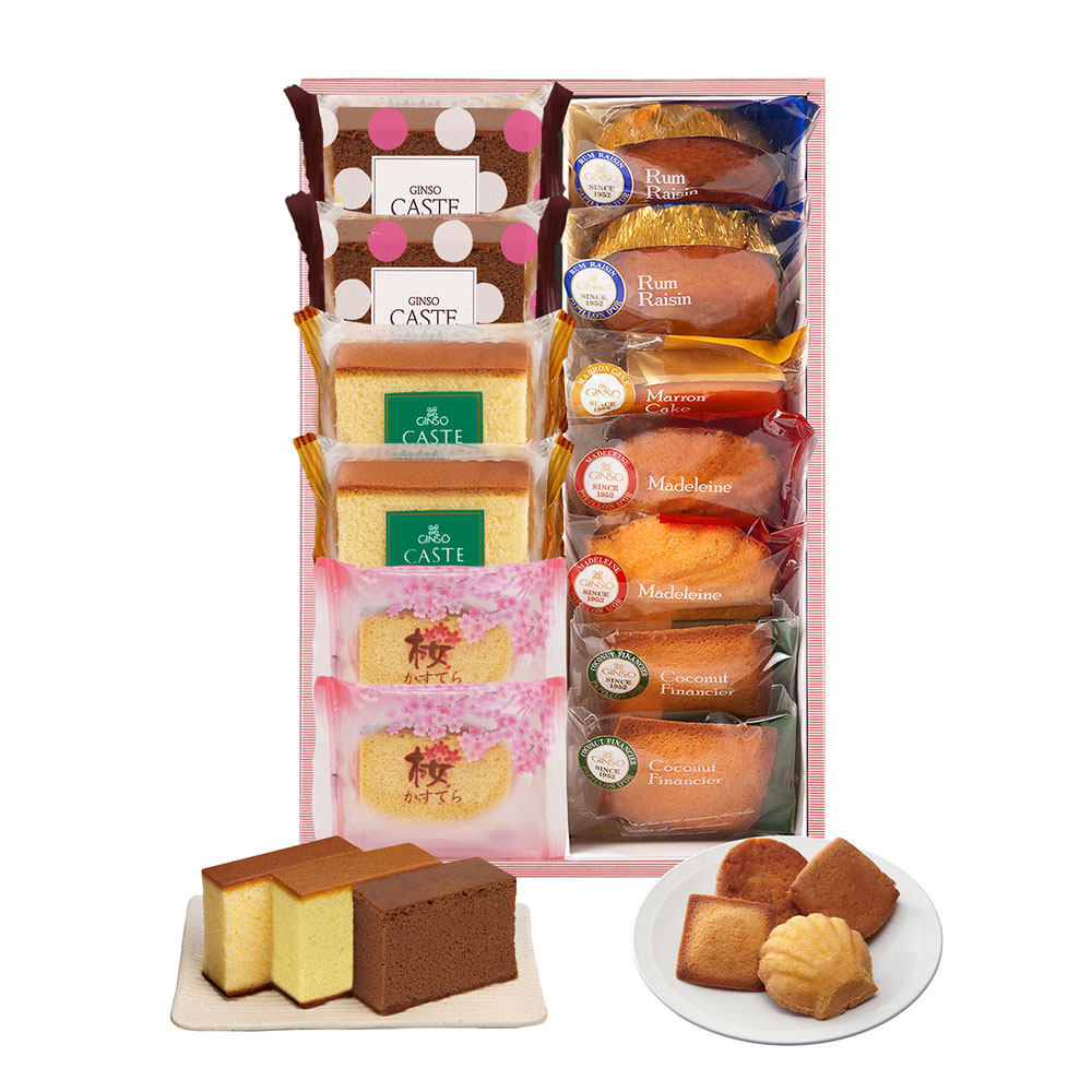 銀装カステラはこだわりの原料と独自のカステラ製法で焼き上げたキメ細やかでしっとりした味わいが特徴です。美味しさそのまま個包装になった定番の「カステ21<青箱>」、チョコレートの味わい豊かな季節限定「チョコレートかすてら」、大島桜の桜葉を使用した春限定「桜かすてら」の3種のカステラと、伝統的なレシピで焼き上げたバターの風味豊かなマドレーヌ、ココナッツフィナンシェ、ラムレーズン、マロンケーキを詰合せました。すべて個包装になっているので、お好きな時に好きなだけ、様々な味わいを楽しめるバラエティ豊かなセットは美味しくて楽しいとっておきのひとときをお届けする贈りものです。