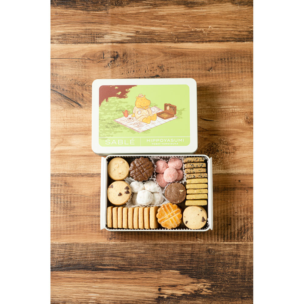 大人気のサブレ缶に新商品が登場。のんびりお休みを満喫するカバの「トシヒポ」が可愛いサブレ缶。フランス、スイス、オーストリア、ベルギーなど鎧塚シェフの修業地の銘菓をToshi風にアレンジ。創業より人気の「サブレアマンド」や「サブレショコラノワゼット」に加え、「ガレットブルトンヌ」や「ブールドネージュ」などの伝統的なサブレも再現。Toshi自慢のピスタチオ味のサブレも入ったおすすめの逸品です。