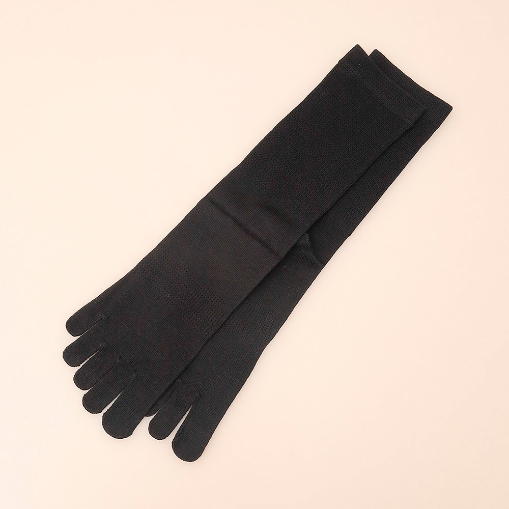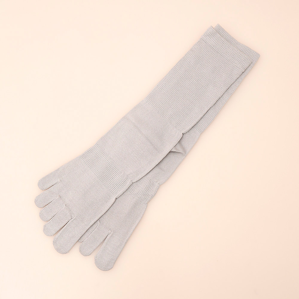 絹糸の中でも美しい極細の糸で、優しくしっとりした着け心地の商品に仕上がりました。なめらかに織られた生地は、お肌に直接あたる商品(肌着やベビー腹巻など)に使用されます。薄くてすっきりと仕上がりながら、ふわふわの触感で、しっかりとした吸湿性を発揮します。かかとつきタイプで、しっかりフィットながらなめらかで、履きやすい仕上げになっております。見た目も肌ざわりもしっかり贅沢。特別な日の自分へのご褒美としてもご愛用ください。