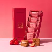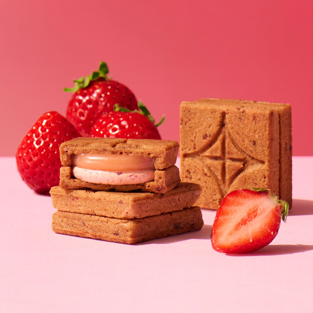 クッキー、バターキャラメル、バタークリーム全てにいちごを使い、いちごの芳醇な味わいが堪能できるバターサンド〈贅沢いちご〉。サクサクに焼き上げたクッキーに、いちごのペーストやフリーズドライのいちごを練り込んだバタークリームと、いちごの濃縮果汁を使用したバターキャラメルをはさみました。いちごの味わいが口いっぱいに広がり、プチプチとした食感も楽しめる、贅沢ないちごのマリアージュをお楽しみください。