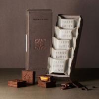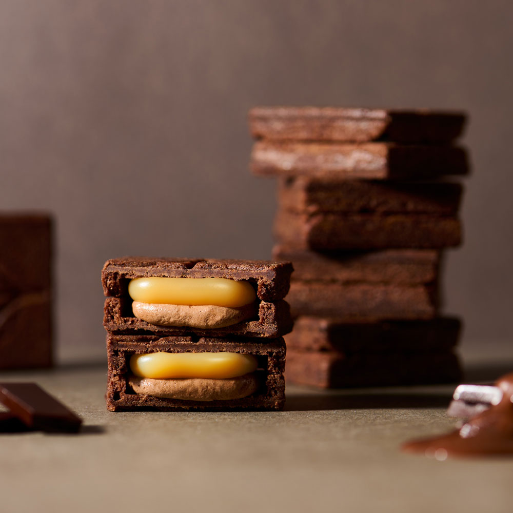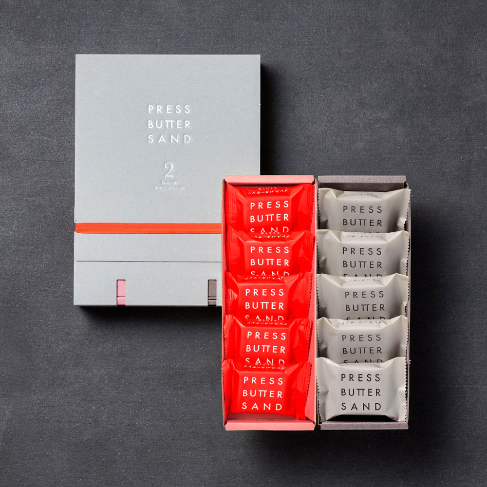 福岡県産 「あまおう苺」の苺バタークリームと苺バターキャラメルを使用した、バターサンド〈あまおう苺〉。一口かじると、苺の美味しさがとろりとあふれ出し、口いっぱいに広がります。ほどよい甘さと軽やかな味わいが魅力のバターサンド〈チョコレート〉はオリジナルのプレス機で「はさみ焼き」にしたサクサクのチョコレートクッキーに、チョコレートバタークリームとバターキャラメルを2層に挟みました。ギフトに人気のスリーブセットでのご用意です。