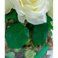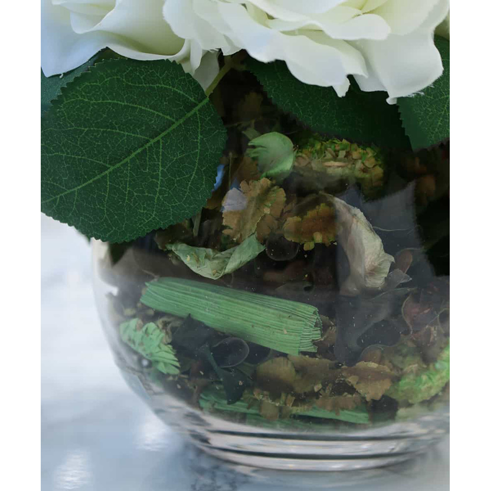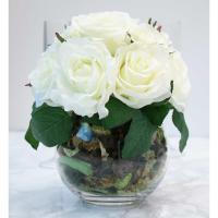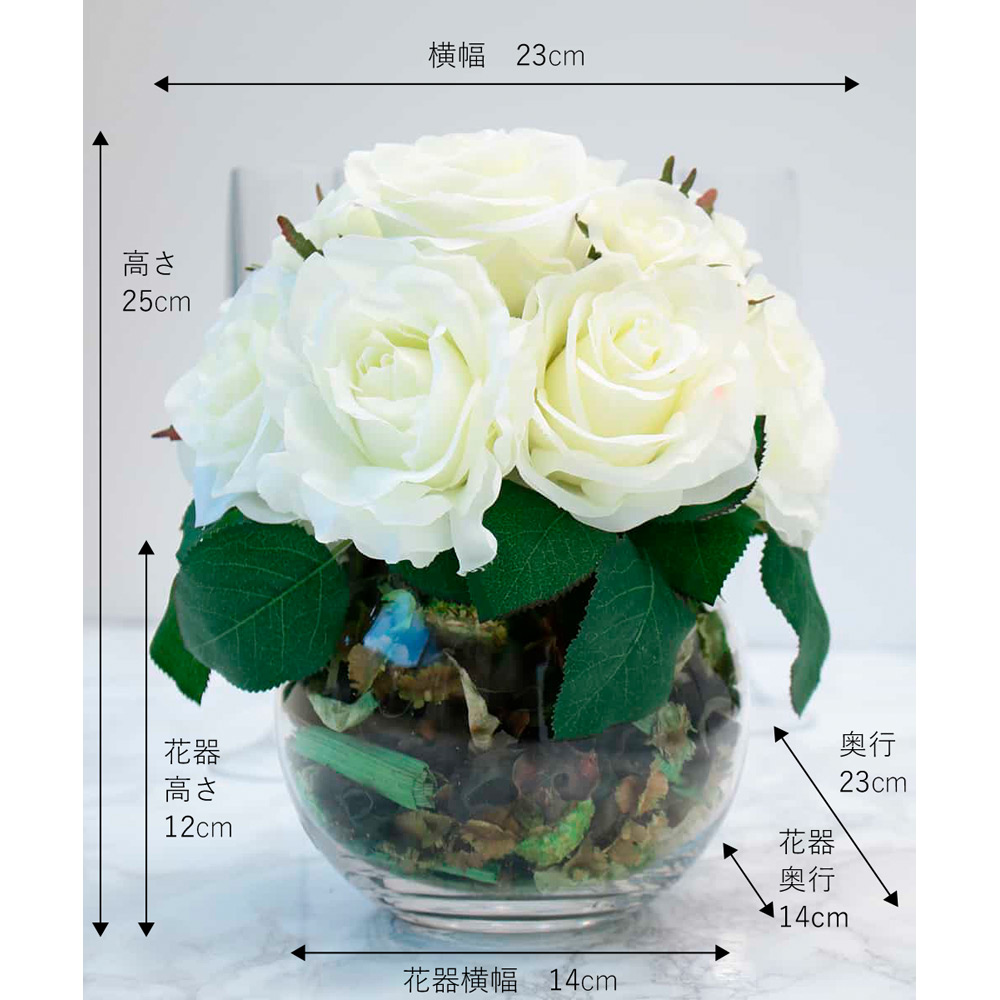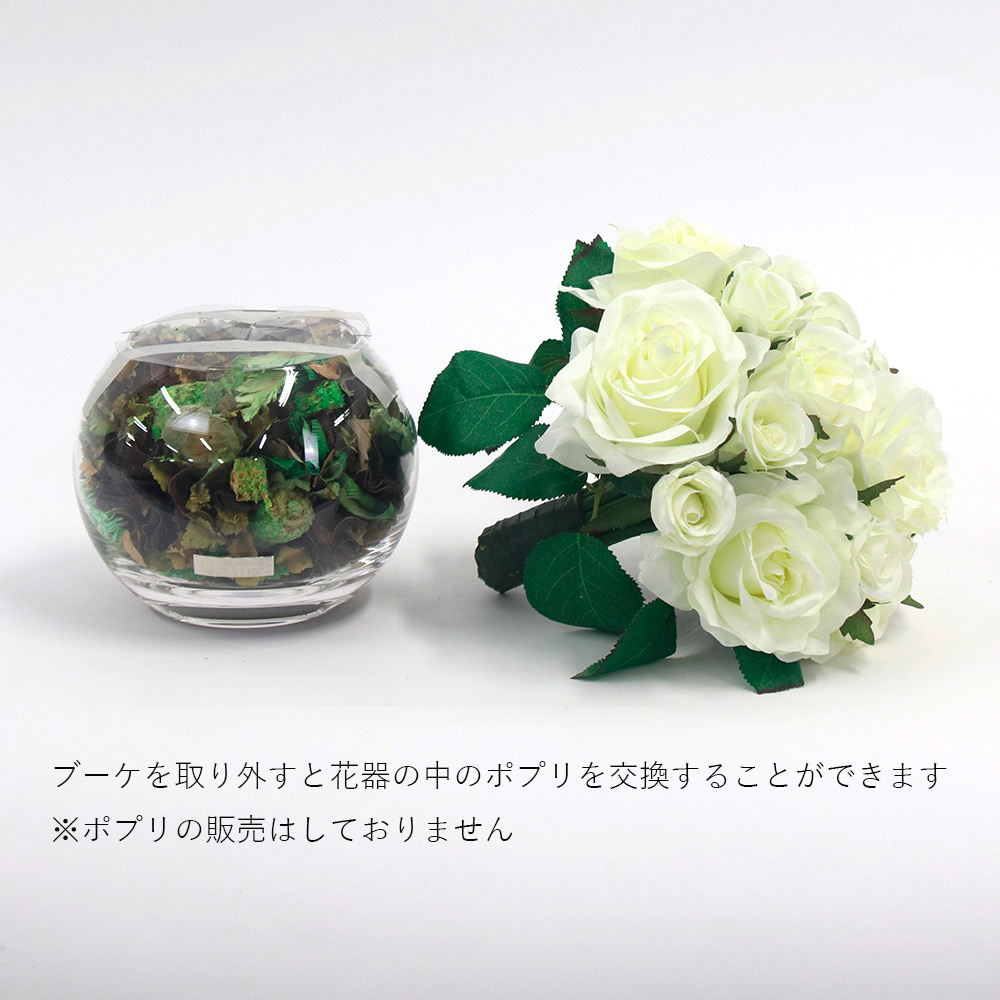 純白なローズだけの上品なデザイン。花器の中には香りのついたポプリが入っています。誕生日や結婚のお祝いなどにも人気のデザインです。