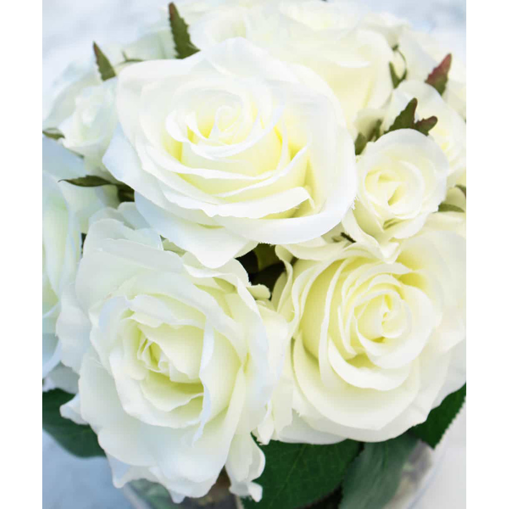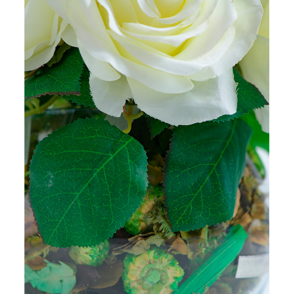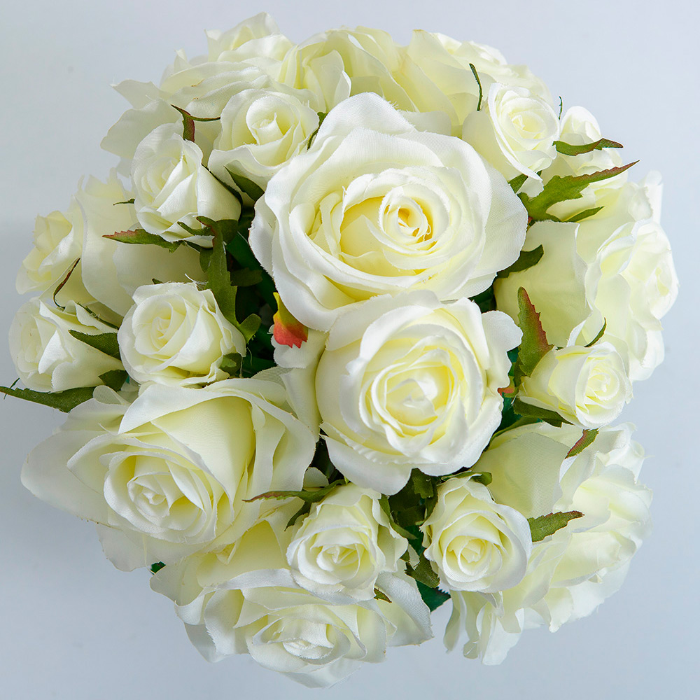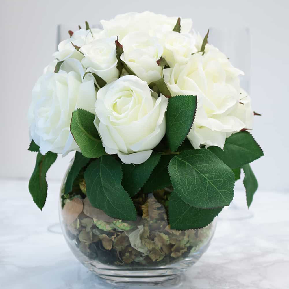 純白なローズだけの上品なデザイン。花器の中には香りのついたポプリが入っています。誕生日や結婚のお祝いなどにも人気のデザインです。