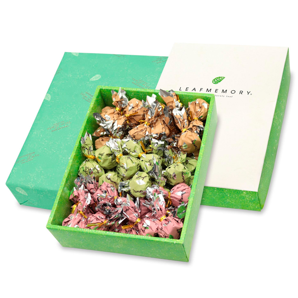 リーフメモリー 緑(ダーク・抹茶・ミルク)・桃(クランベリー、キャラメル、ミルク)×各18個、橙(ホワイト、モカ、ミルク)×19個 計55個入