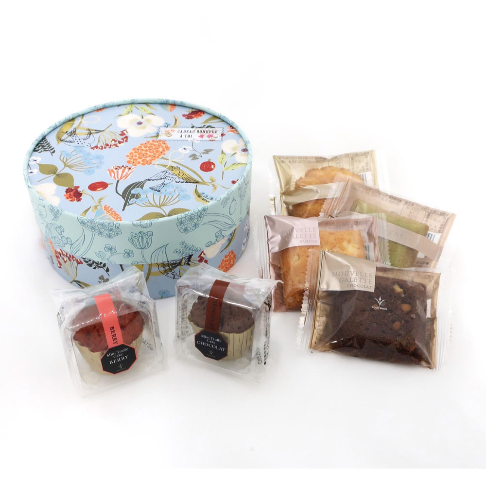 人気のミニトリュフケーキ2種、フィナンシェやガレットなど、カラフルな焼き菓子を限定BOXに詰め合わせました。贈りものにぴったりです。