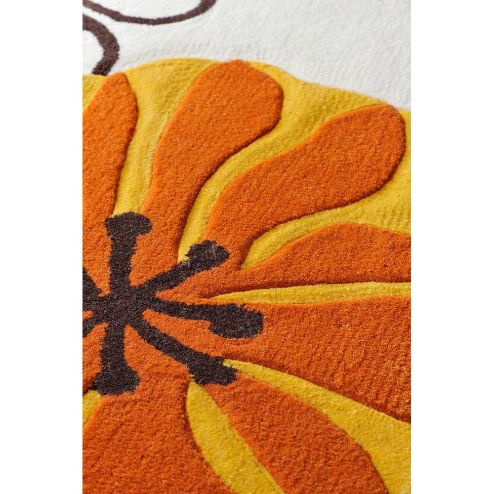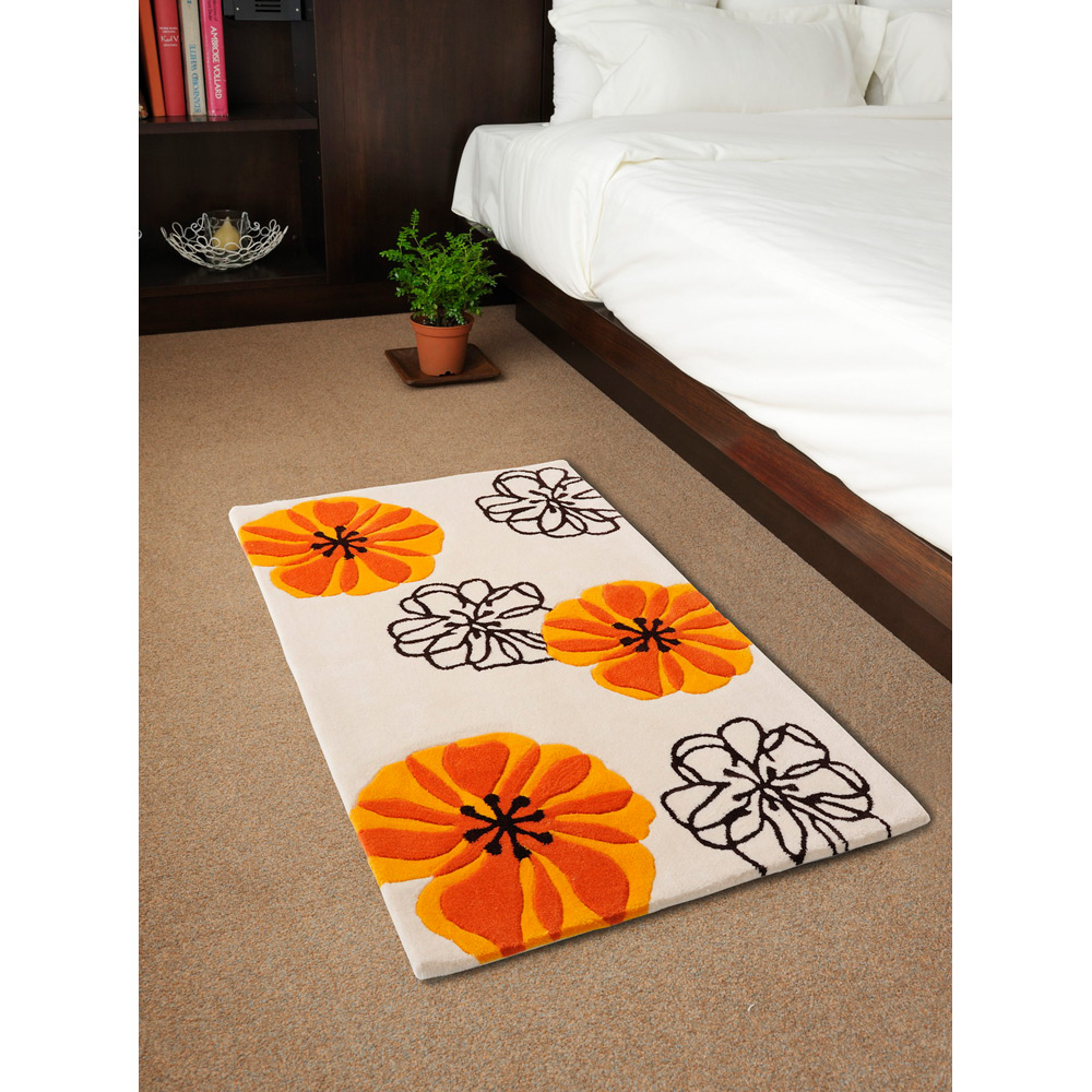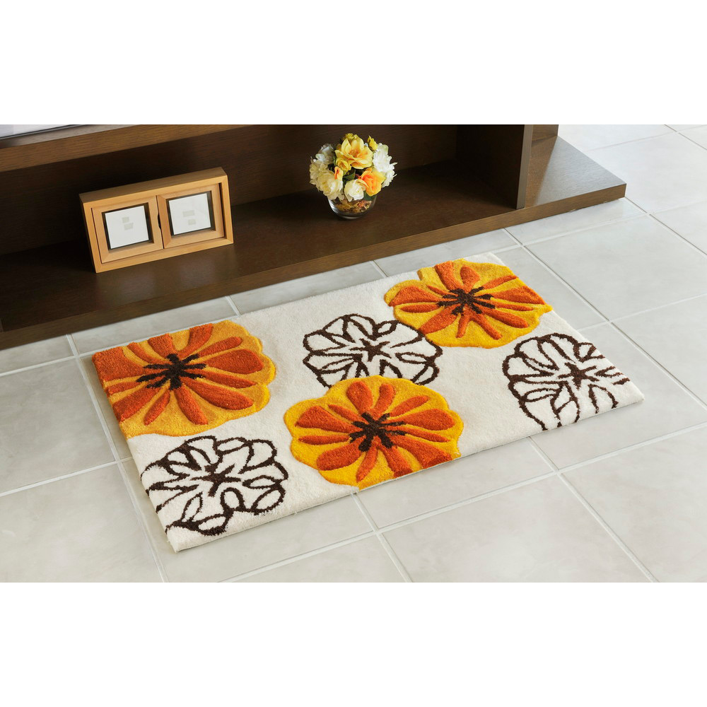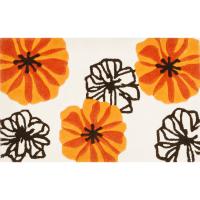 アイボリー地にひときわ目立つオレンジの花を咲かせました。あなたのお帰りを元気いっぱいに迎えてくれる、そんな玄関マットです。最長約12mmのパイル長と打ち込みもよく、足あたりがソフトで踏み心地もふかふか。汚れてもご家庭で手洗い可能で、いつも清潔にお使いいただけます。裏面は滑り止め付きだからズレにくい仕様です。