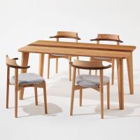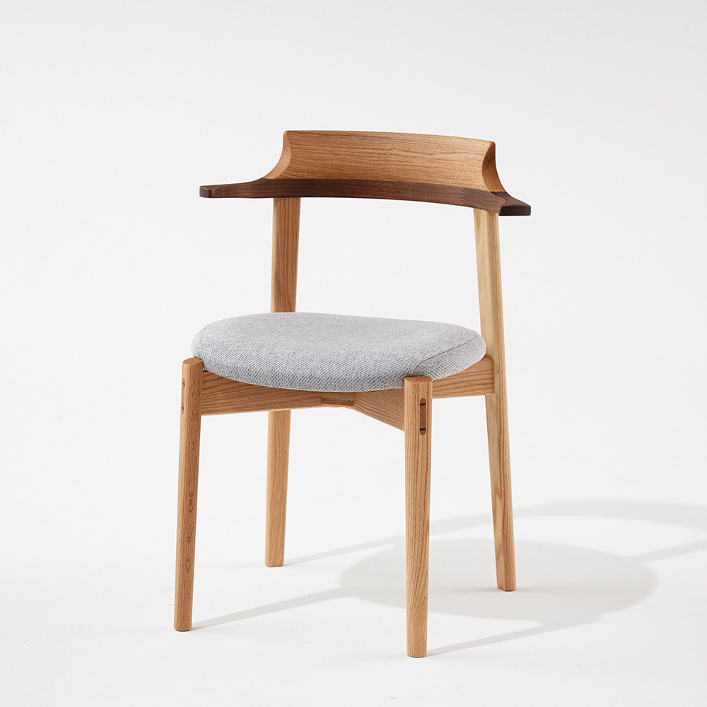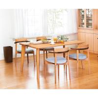 家具の産地として知られる飛騨高山のメーカーによる国産製品です。ナチュラルな木の風合いのダイニングテーブルは天板がオーク材にウォールナット材でアクセントをつけたデザイン。チェアは軽量で、軽く肘がかけられるセミアームタイプ、座面はグレー色の布張りです。長くご愛用いただける飽きのこないデザインです。