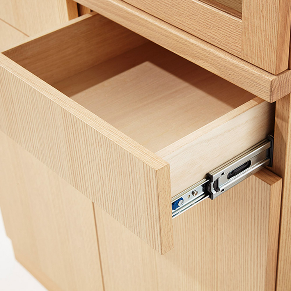 家具の産地として知られる飛騨高山のメーカーによる国産製品です。収納力たっぷりのダイニングボード。棚は可動式で収納するものに合わせて調整ができます。カラーはナチュラル色、開閉はプッシュ式で、スムーズに出し入れできるスライドレール付の引出しが2杯ついています。同デザインのカウンターボードと組み合わせてもご使用いただけます。
