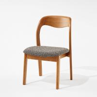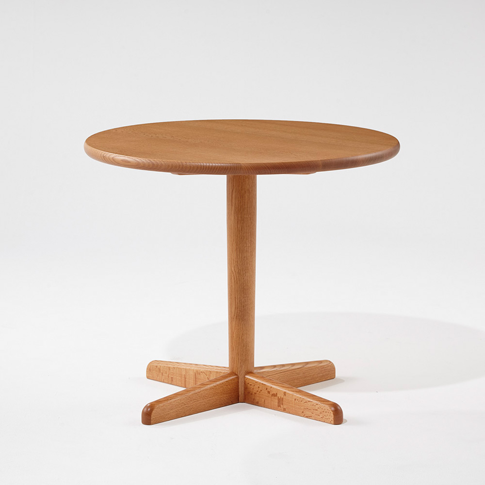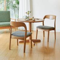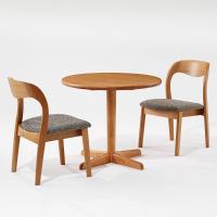 家具の産地として知られる飛騨高山のメーカーによる国産製品です。オーク材のシンプルなデザインのダイニングセットはテーブルがコンパクトな円形。チェアは曲線を生かしたデザイン、座面はグレー系の布張りで、長くご愛用いただける飽きのこないデザインです。
