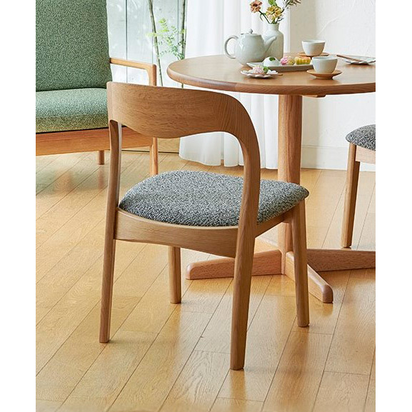 家具の産地として知られる飛騨高山のメーカーによる国産製品です。オーク材の曲線を生かしたデザインのチェアは座面はグレー系の布張り、長くご愛用いただける飽きのこないデザインです。