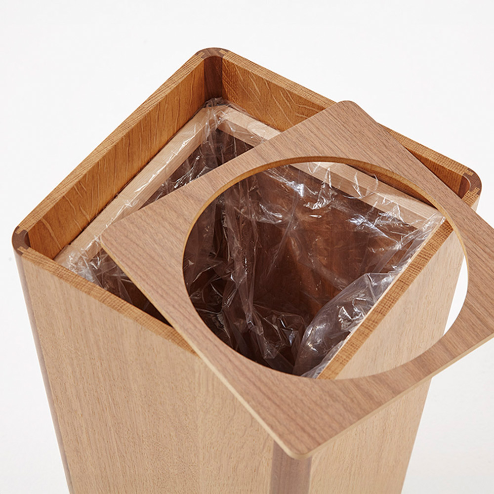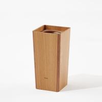家具の産地として知られる飛騨高山のメーカーによる国産製品です。シンプルなデザインのオーク材とウォールナット材の2色使いのダストボックス。ウォールナット材とオーク材2色のリバーシブルの内蓋が付いていています。内側にビニール袋を挟んでお使いいただけます。