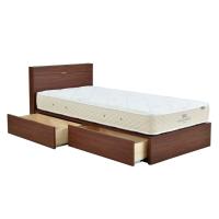 一流ホテルでも使用されているマットレスに拘る「日本ベッド」。一つ一つのスプリングが独立したポケットコイルを組み込んだ「ビーズポケット」マットレスを使用しています。「ビーズポケット」はしなやかでしっかりとした姿勢保持力が特長。独立したポケットコイルスプリングが、ほどよい硬さで体を支えます。マットレスの側面には内部の通気を促すため、ベンチレーター(通気穴)が付けられています。棚が付いた小物が置けるデザイン。スライドレールの付いた引出しが2杯ついていて収納力も十分です。ヘッドボードはウォールナット色でシンプルなデザイン。LED照明・コンセント付。ベッドパッド、シーツ各1枚付。