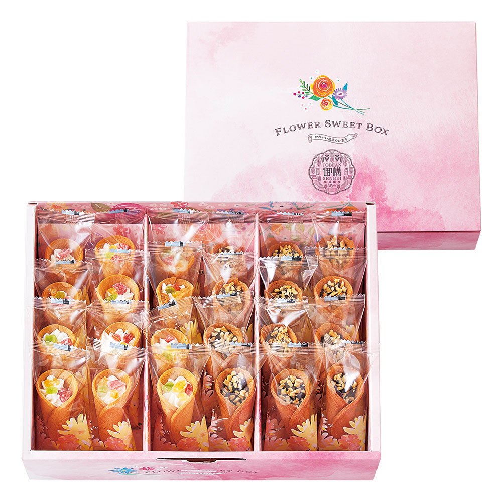 食べられる、可愛いお菓子の花束。くるりと丸めたおせんべいに、バニラクリームとチョコクリームをそれぞれ絞りました。
