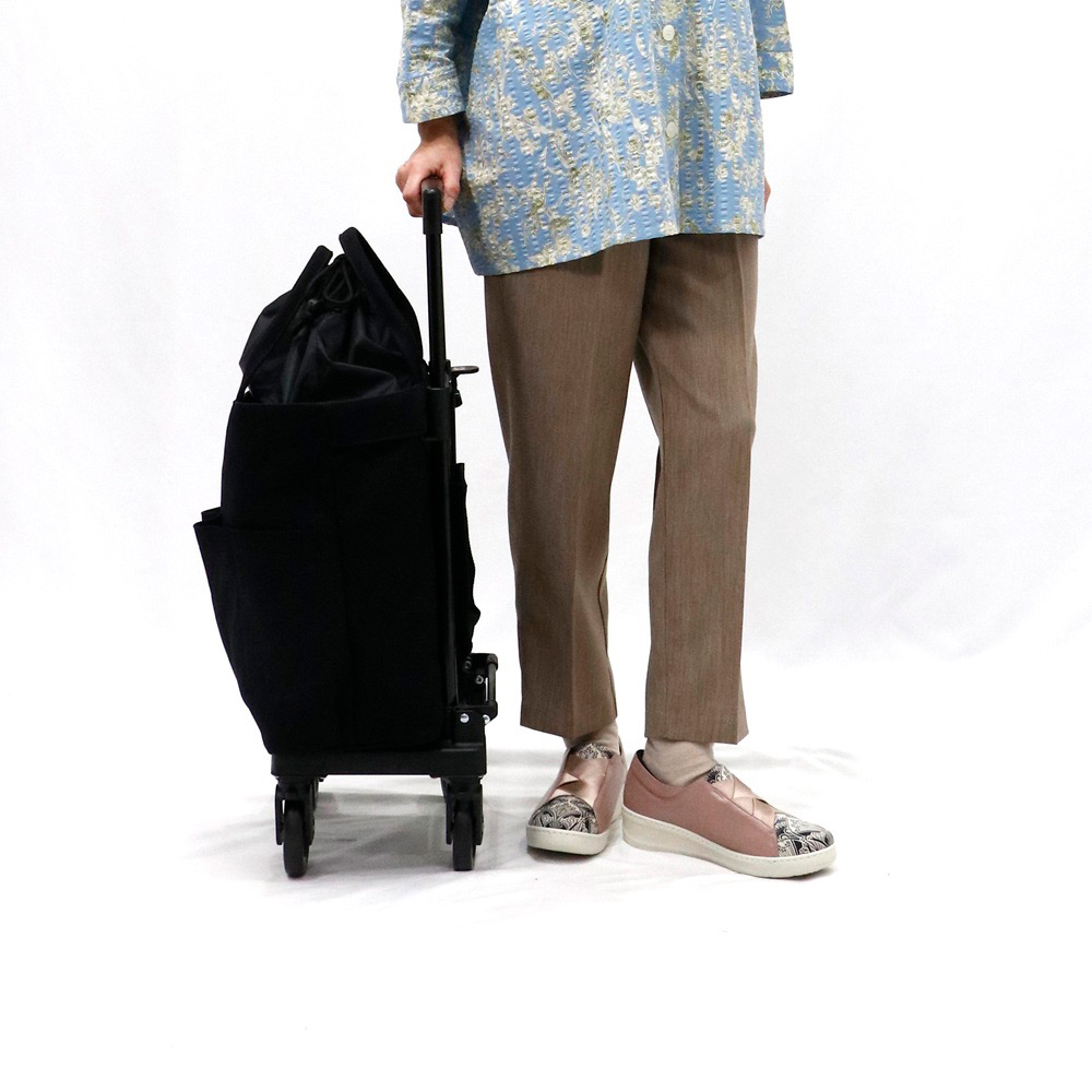 帆布は使い込むほどに柔らかくなり味のある風合いが楽しむことができます。身体の横に沿わせて押すタイプの横押しのショッピングカート。旅行やお買い物で荷物が増えた時も重宝します。バッグはカートから取り外して、単体のトートバッグとしてもご使用いただけます。外側・内側にそれぞれ4つのポケット付いているので整理がしやすく、荷物の増減にも対応できる巾着式の開口部で収納力も抜群です。360度回転する4輪キャスターは小回りがきき、タイヤ直径が約10cmあるため多少の段差も乗り越えます。バスや電車で便利な駐車ストッパーも搭載と、細部まで使いやすさにこだわった設計です。手元でハンドル部分の調整(5段階調節)がワンタッチでできます。ポケット外側:前オープン×3 背面×1 内側:オープン×4