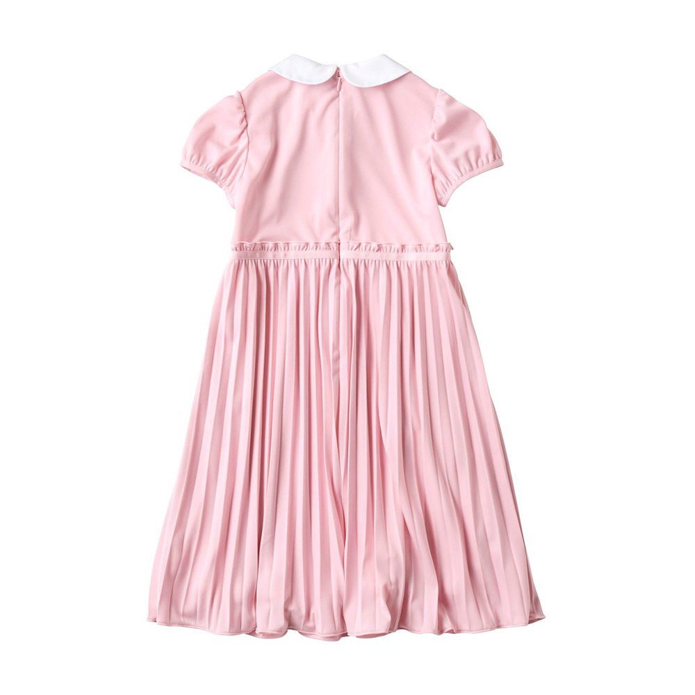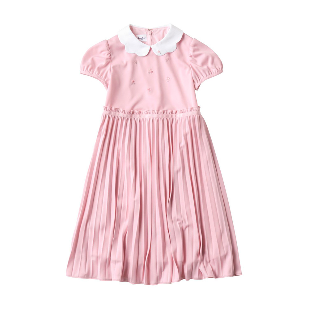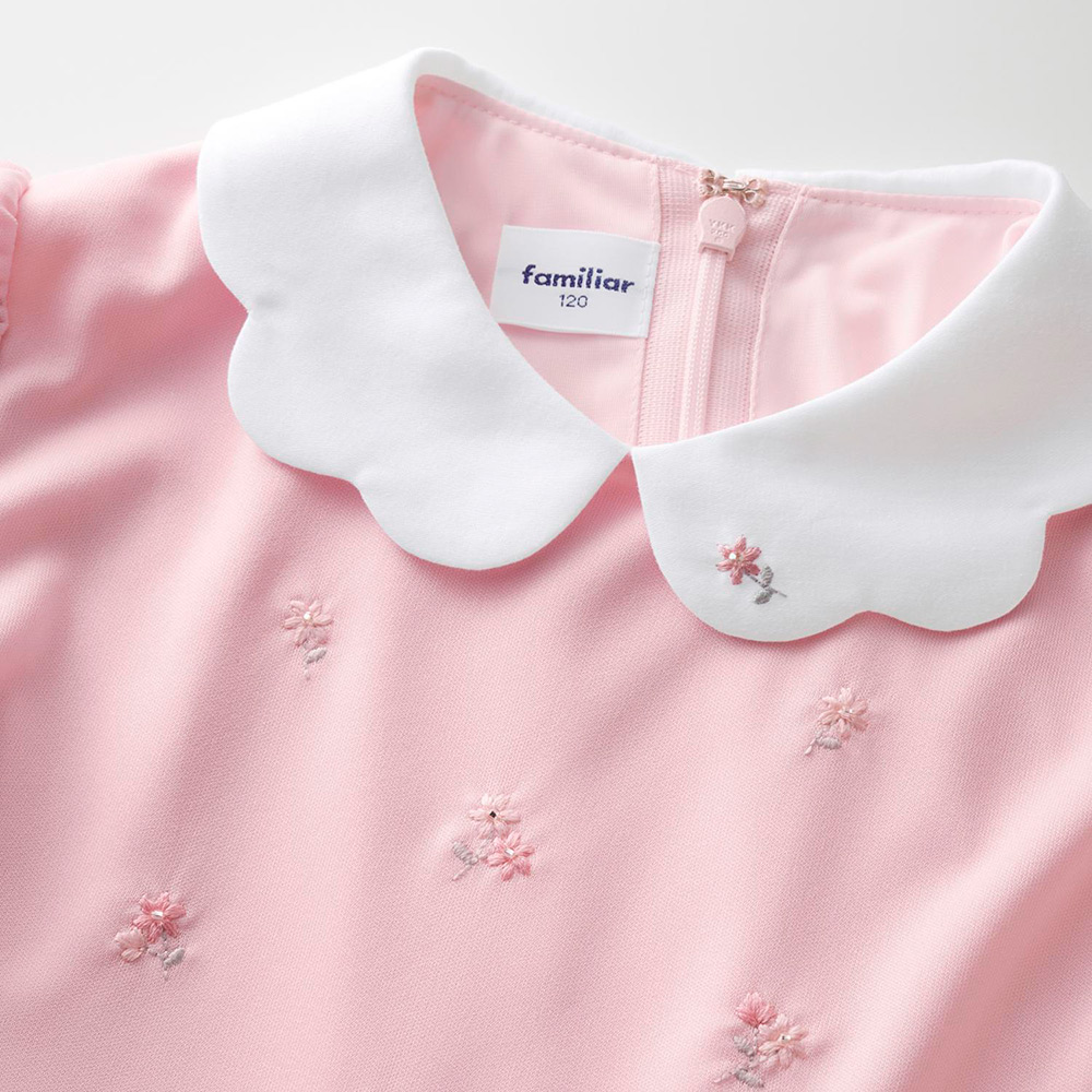 上品な白襟・胸元にはお花の刺繍がポイント。カットソー素材で着やすく、お手入れもしやすいです。スカート部分はドレープ感があり上品で美しいシルエットで、入学式や結婚式などのセレモニーシーンでのご使用におすすめです。