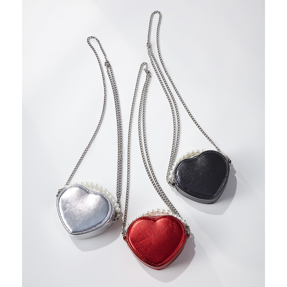 シルバーのチェーンと、パールビーズのストラップがアクセントの可愛いハート型ポシェット