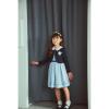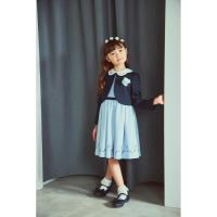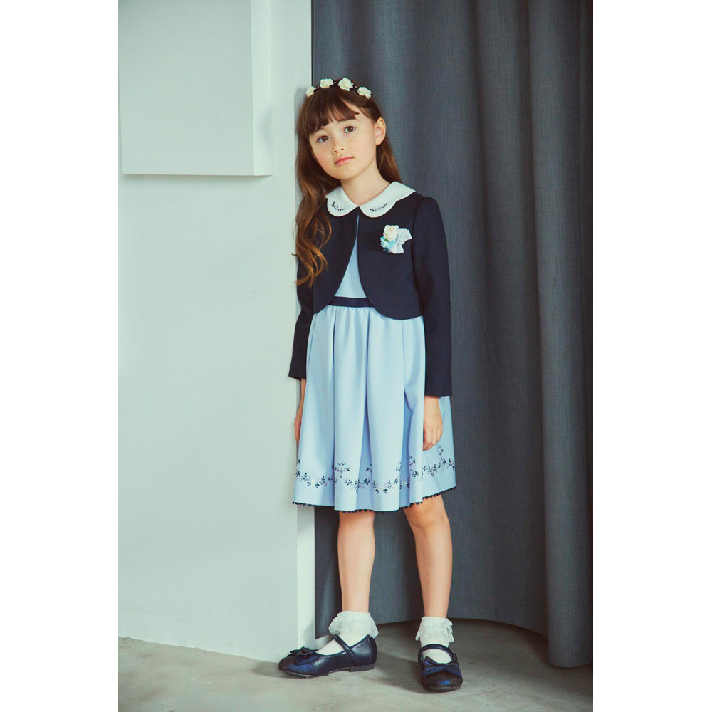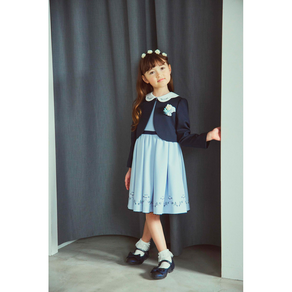 ネイビーのボレロと襟に刺しゅうを施したワンピースのアンサンブル。襟付きのワンピースは発表会やパーティーなど特別な日もぴったり