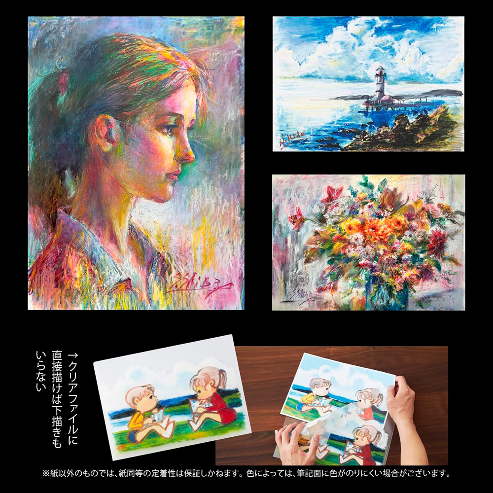 大人が日常で描くことに寄り添う「アートクレヨン」は、クレヨンの手軽さで、油絵のようなタッチの絵を描ける画材です。筆圧によって線幅を自由自在にコントロールできる柔らかなテクスチャで、鮮やかなまま色を混ぜ合わせたり、何度も重ねたりすることができ、多彩な表現を愉しめます。