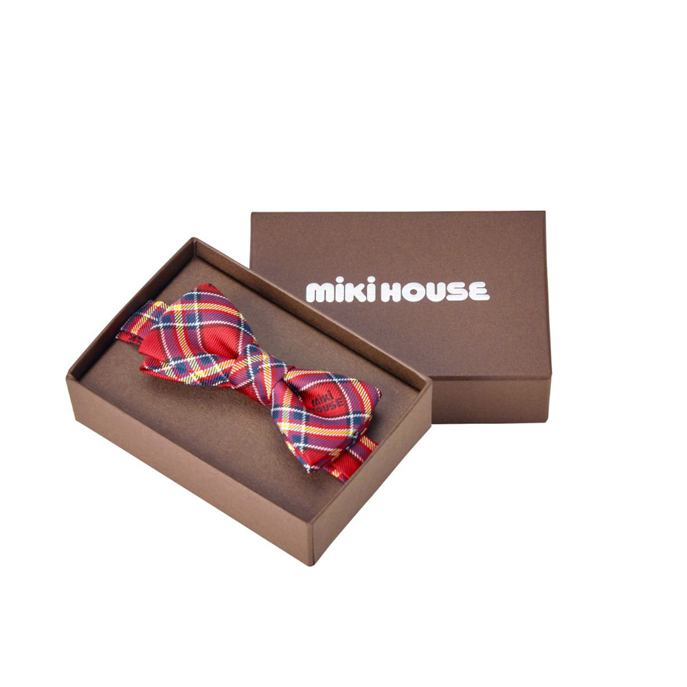 最高品質のシルクを使用したMade in 京都(西陣織)のミキハウスチェック柄蝶ネクタイ。フックで簡単に着脱できます。パーティなどのフォーマルシーンに。