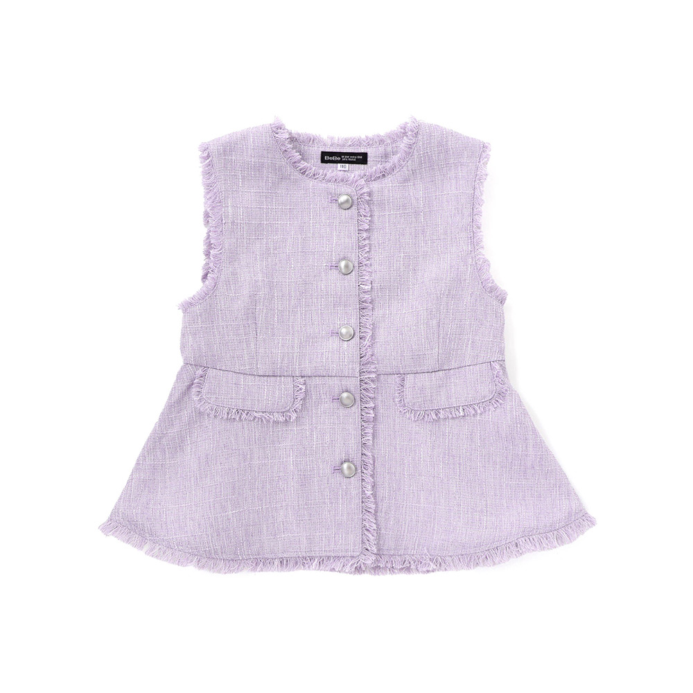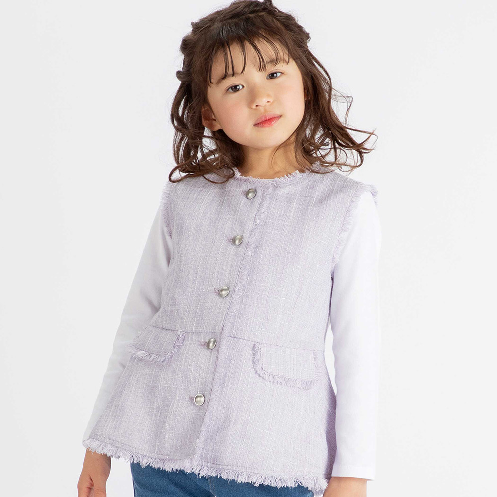さらっと軽いサマーツイード素材。フリンジデザインが、レディースライクな大人可愛い1着。シルバーのメタルボタンもポイント。デニム等を合わせてカジュアルダウンしたスタイリングも可愛いです。