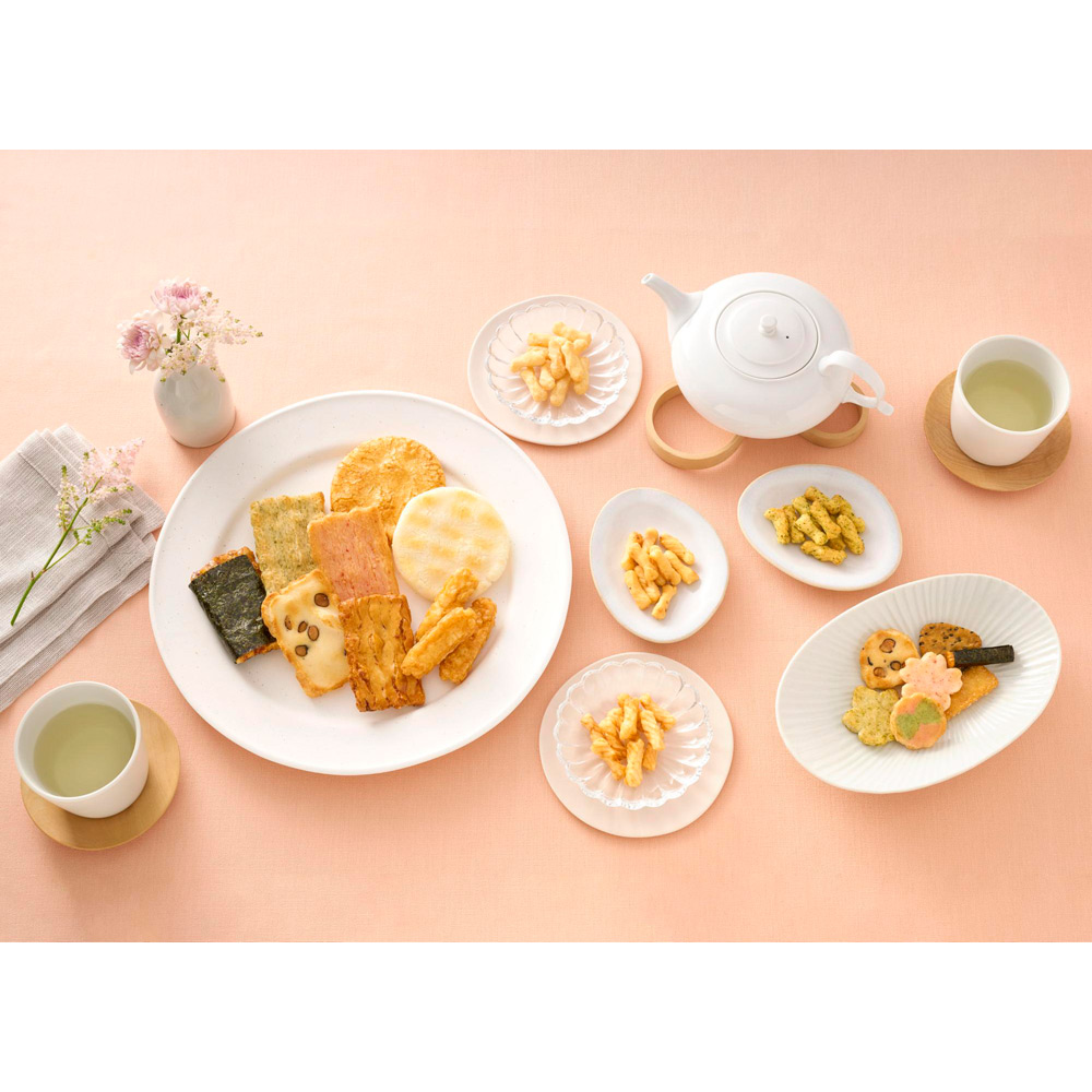 一口サイズの7種類の米菓に豊かな四季を映した「ななよせ」、いろどり豊かな食べ応えのある本格おかきや軽い口あたりのおせんべいを詰め合わせた「かのか」、小粒あられ4種の味を詰め合わせた「ハイサラダデリ」の3種類の商品を2箱ずつセットいたしました。3種類商品が各2箱ずつの6箱セットです。