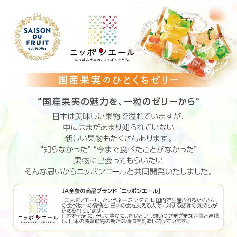 知らなかった、今まで食べたことがなかった果物に出会ってもらいたい、そんな思いからニッポンエールと共同開発したひとくちゼリーです。口いっぱいに果実本来のみずみずしい美味しさが広がります。 ※こちらはセール商品のため、ご自宅用のみの承りとなります。