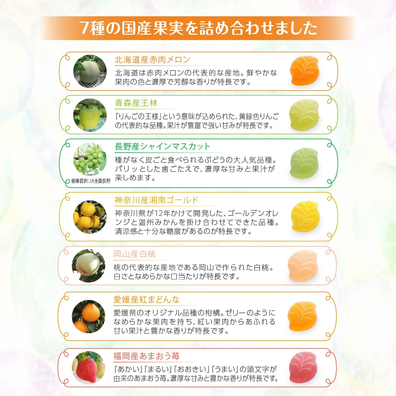 北海道産赤肉メロン・青森産王林・長野産シャインマスカット・神奈川産湘南ゴールド・岡山産白桃・愛媛産紅まどんな・福岡産あまおう苺各7