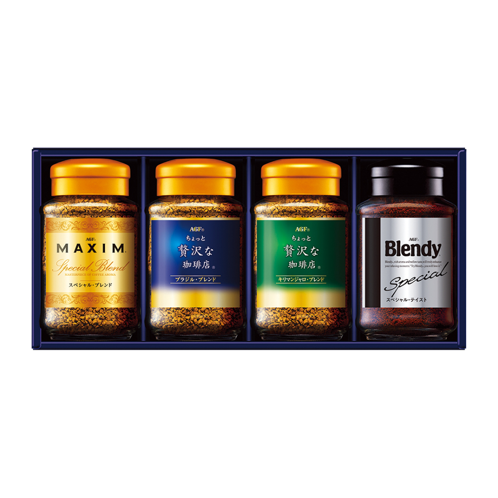 まずはストレートで楽しみたい「ちょっと贅沢な珈琲店」「マキシム」と、深いコクのカフェオレが楽しめる「ブレンディ」をセットにした、色々な味わいが楽しめるインスタントコーヒーギフトです。 ※こちらはセール商品のため、ご自宅用のみの承りとなります。