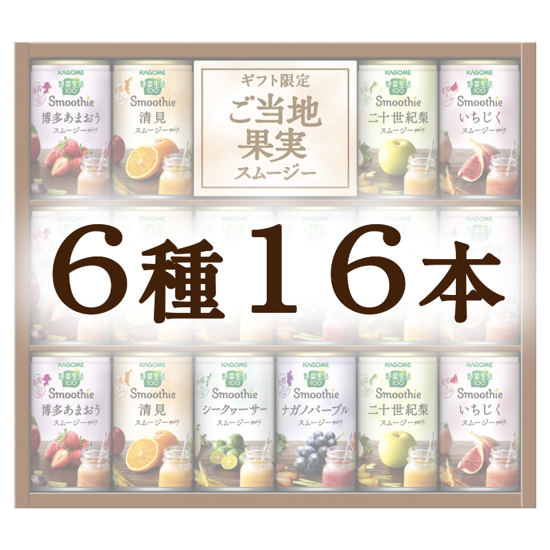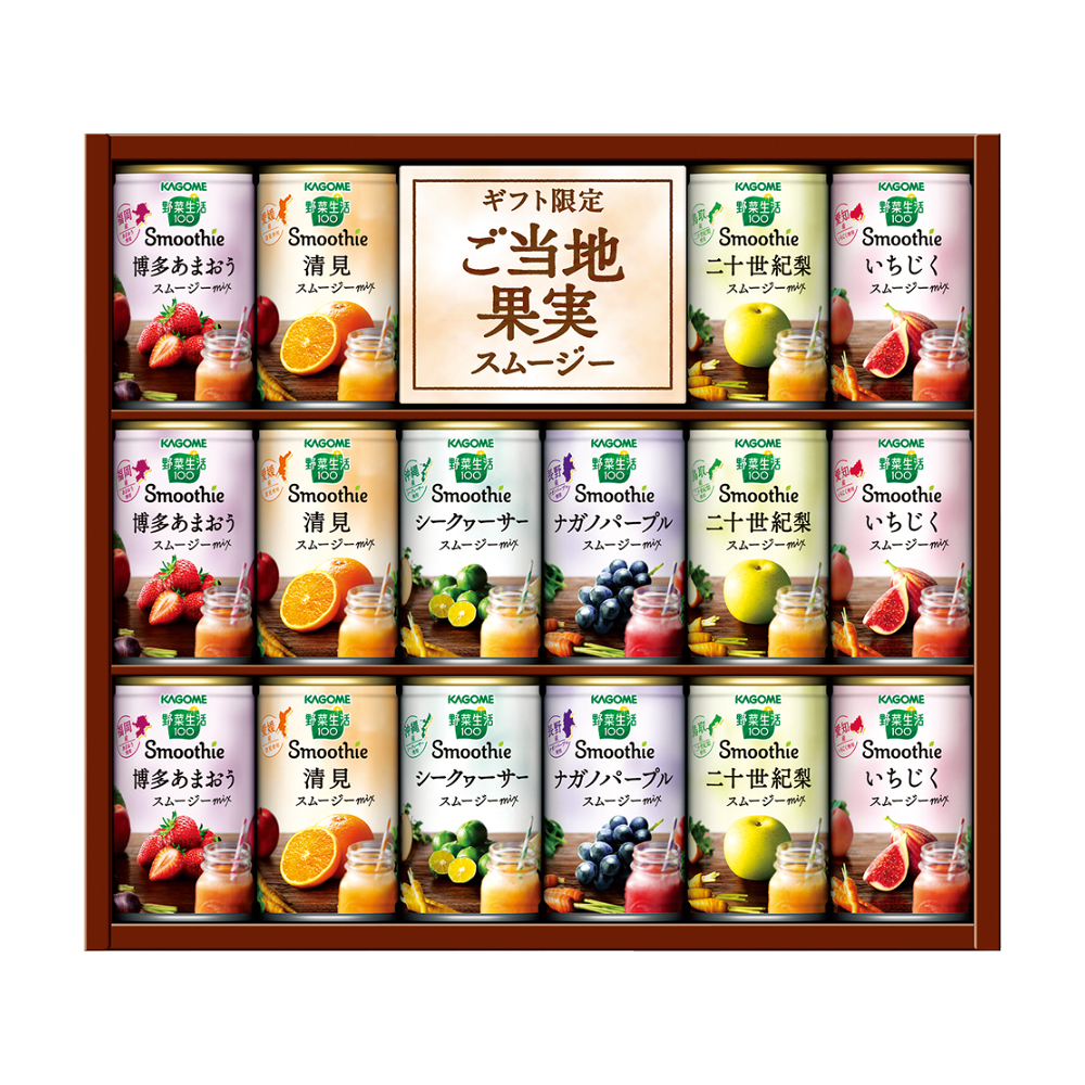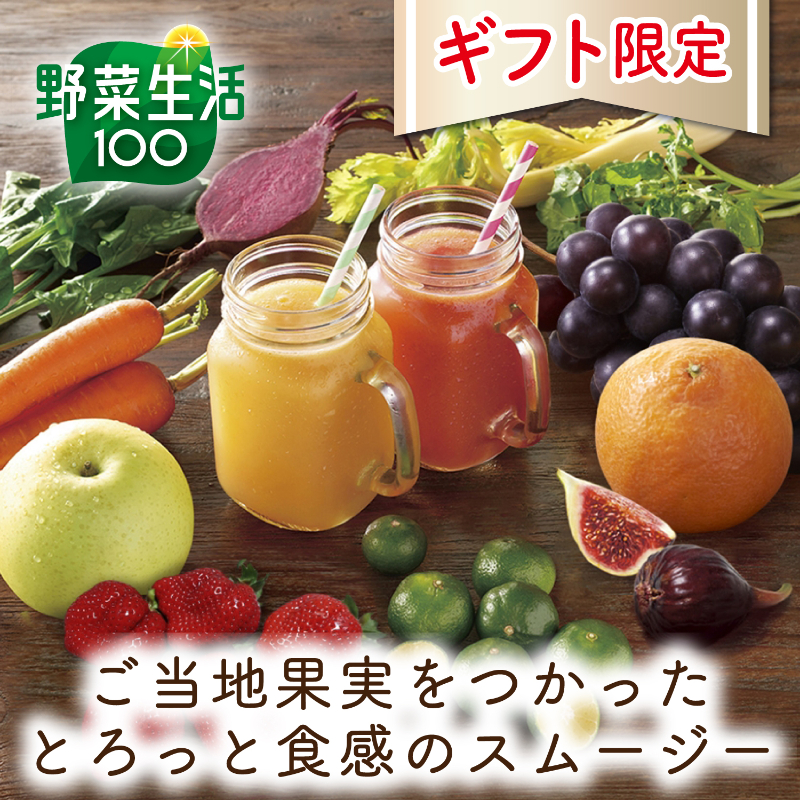 日本の果実の、豊かな個性を味わう。「野菜生活100 Smoothie(スムージー)」ご当地果実ギフトセット。博多あまおう、清見、シークヮーサー、ナガノパープル、二十世紀梨、いちじく、といった全国各地で育まれた6種のご当地果実の味わいと、とろける食感・飲みごたえに仕上げました。全国の生産者の想いが詰まった、ギフト限定の「野菜生活100 Smoothie」。めずらしいものがお好きな方に、旅するような味わいをお届けします。 ※こちらはセール商品のため、ご自宅用のみの承りとなります。