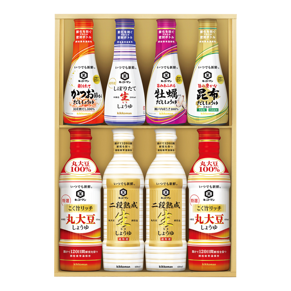 こく旨リッチ特選丸大豆しょうゆ・超特選二段熟成生しょうゆ各450ml×2、しぼりたて生しょうゆ・削りたてかつお節香るだししょうゆ・旨み豊かな昆布だししょうゆ・旨みあふれる牡蠣だししょうゆ各200ml