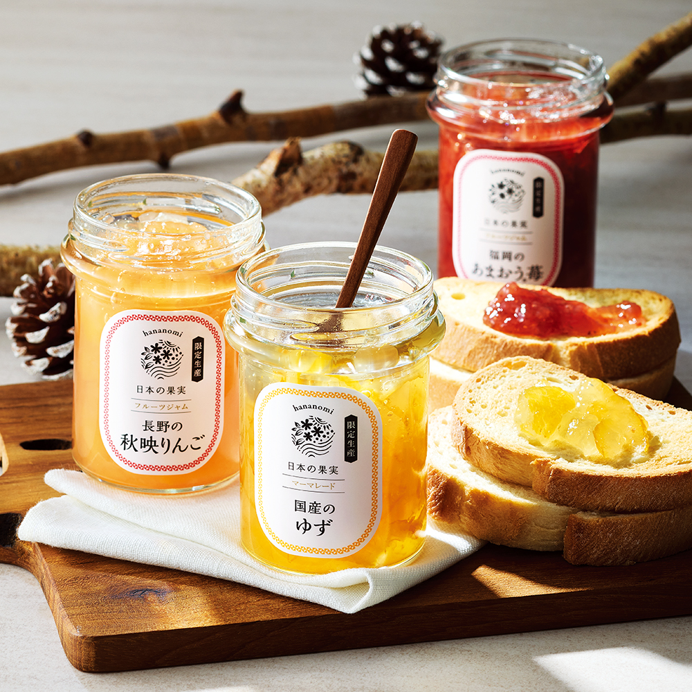 フルーツジャム(福岡のあまおう(R)苺・長野の秋映りんご・和歌山のみかん・国産のゆずマーマレード)各160g