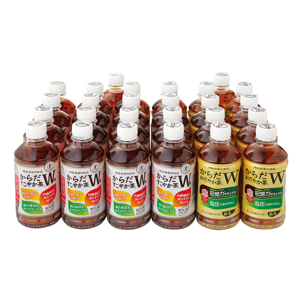 「からだすこやか茶W+」、「からだおだやか茶W」の詰め合わせ。健康が気になる方に。