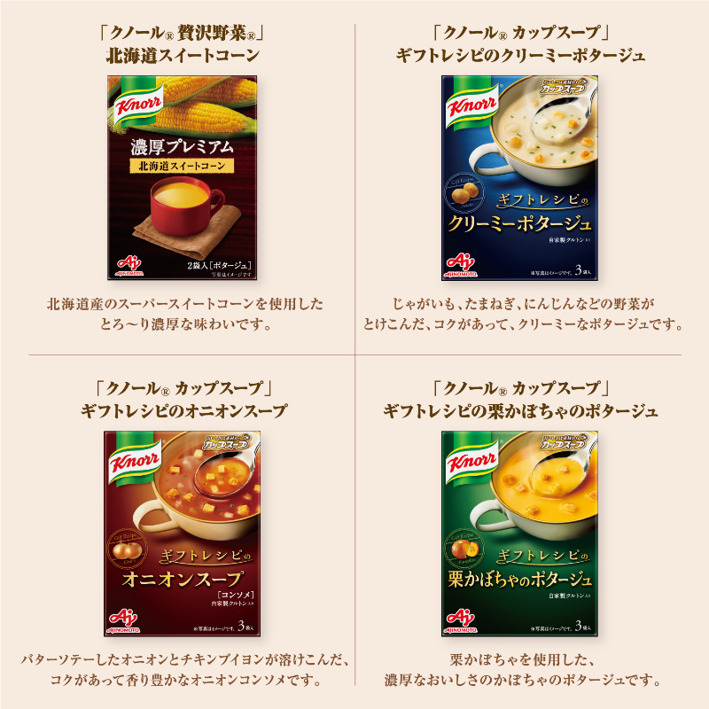 原料や製法など「クノール」のこだわりがたくさん詰まり、素材がじっくり溶け込んだ、味わいの深いスープギフト。いつものクノールよりも贅沢なスープを楽しむことができるプレミアムな贈りものをご自宅用としてお楽しみください。 ※こちらはセール商品のため、ご自宅用のみの承りとなります。