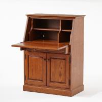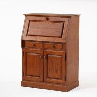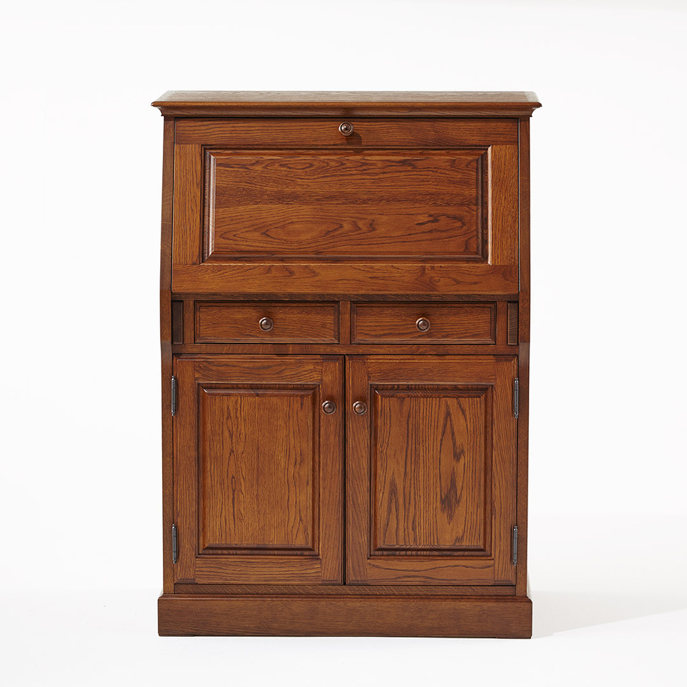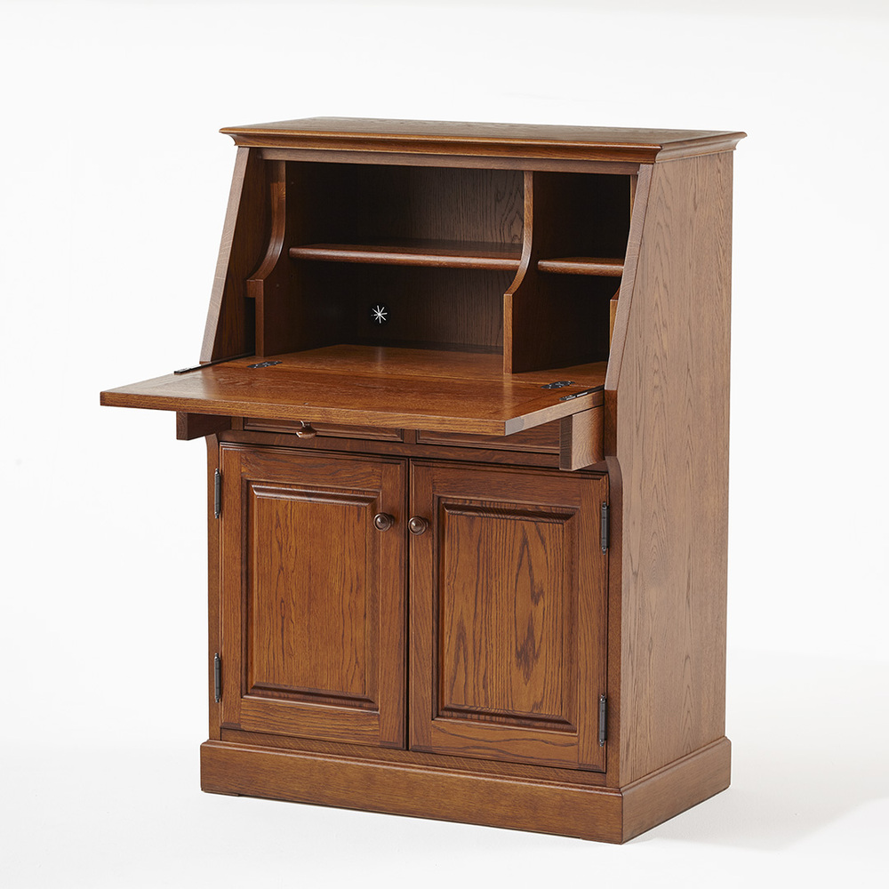 家具の産地として知られる北海道旭川のメーカーによる国産製品です。扉を開けるとデスクになるライティングビューローはオーク材の木目を活かしたナチュラルな木の風合い。下部には引出し2杯と収納が付いていますので書類や小物の整理にも便利です。