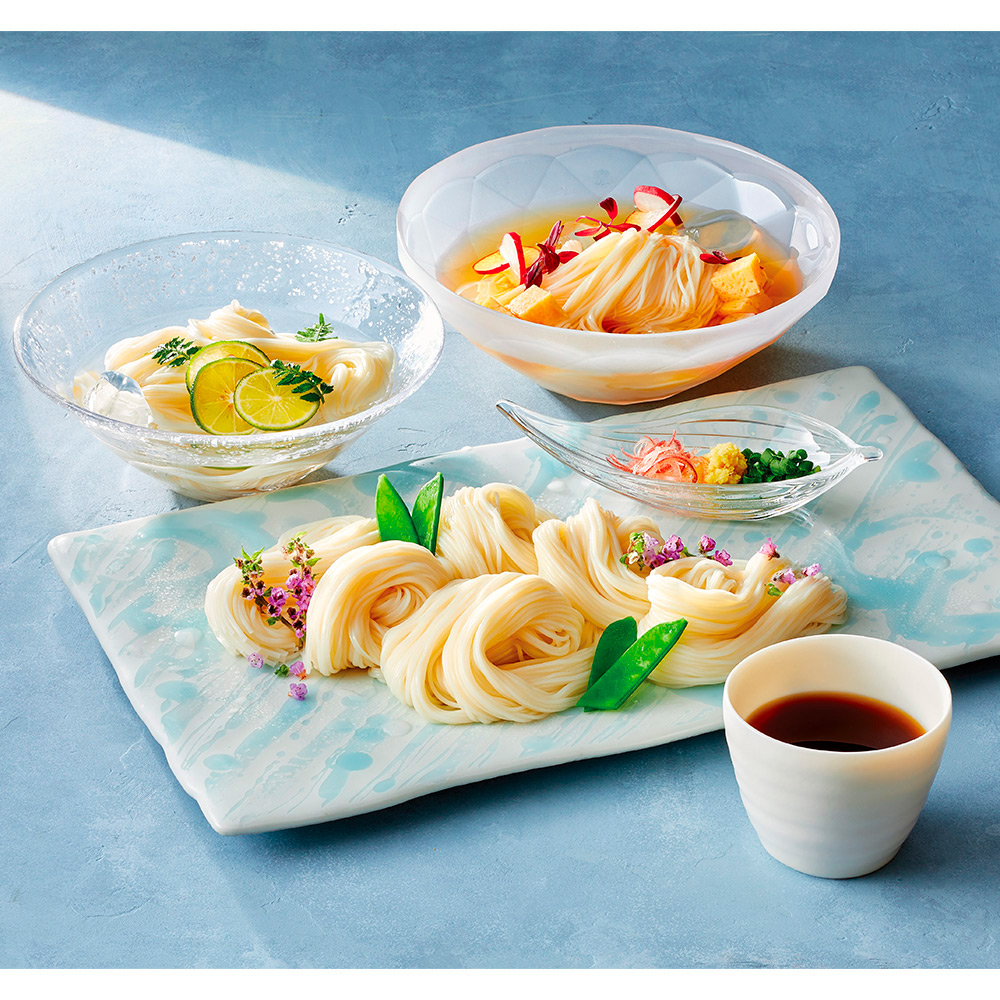 三大産地といわれる三輪・小豆島・播州の素麺のセット。旨みや食感の違いを食べ比べられます。※こちらはセール商品のため、ご自宅用のみの承りとなります。