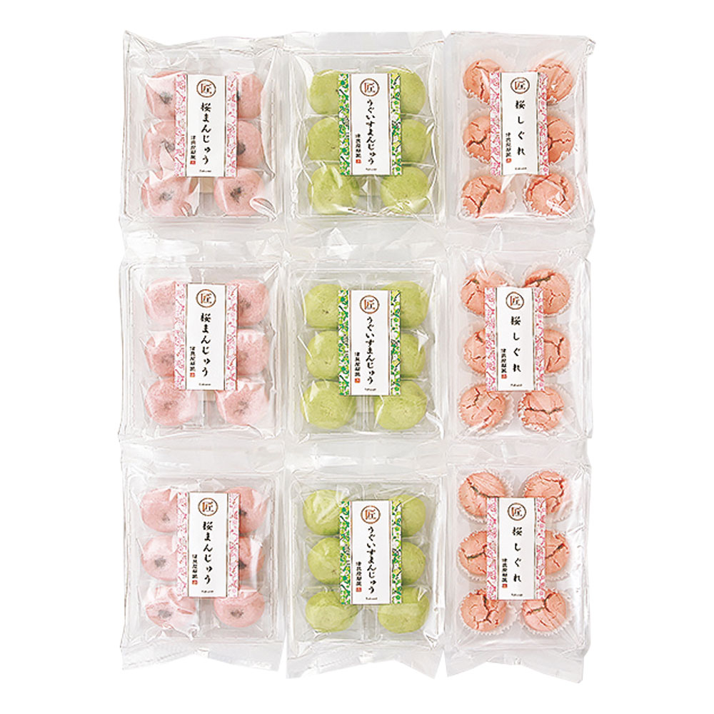 季節限定の桜まんじゅう、うぐいすまんじゅう、桜しぐれの詰合せ。桜あんや桜葉など、甘みの中にやさしい塩味が楽しめます。