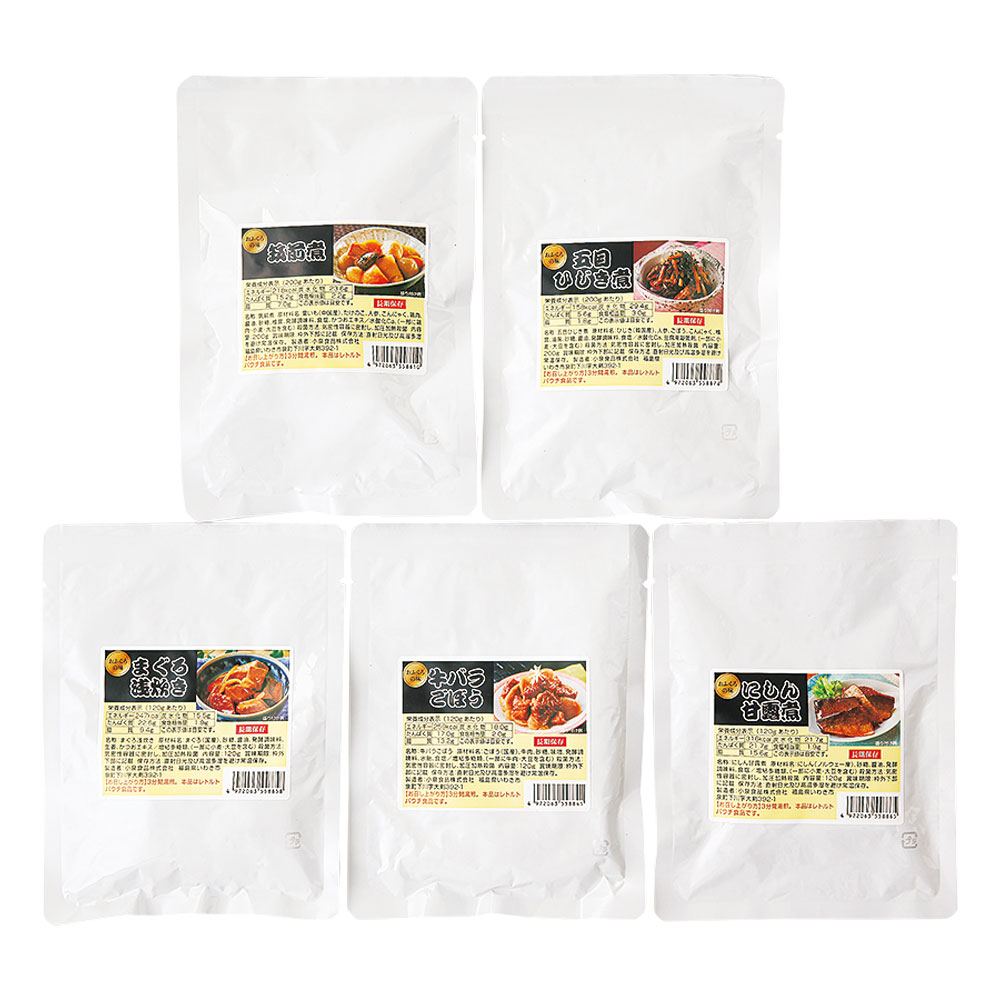 筑前煮200g・まぐろ浅炊き120g・牛バラごぼう120g・にしん甘露煮120g・五目ひじき煮200g×各2袋、5種計10袋
