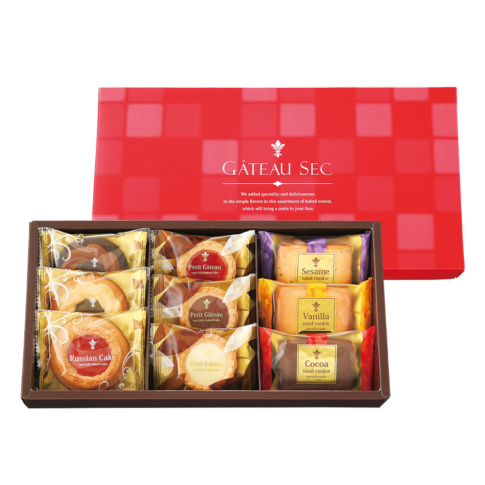 ロシアケーキ(マカロンストロベリー1個、フラワーキウイ1個、リッチビター1個)、プチガトー(ストロベリー1個、ミルクチョコ1個、ホワイトチョコ1個)、サンドクッキー(ココア1個、バニラ1個、セサミ1個)、9種計9個
