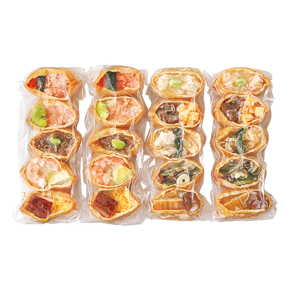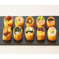 新春の食卓が華やぐ山海の幸を飾ったいなり寿司。米酢を用いたまろやかな酢飯を甘さ控えめの油揚げで包みました。かに、いくら、鰻、牛しぐれなど10種の具材を楽しめます。