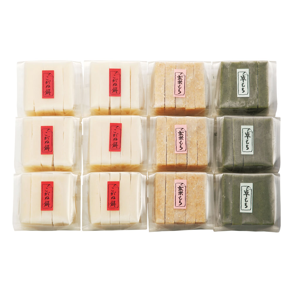 こがね餅5枚×6袋、草もち・玄米もち各5枚×3袋、3種計12袋