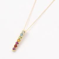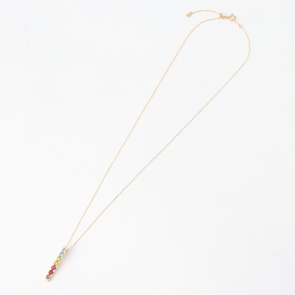 胸元に、幸運を呼ぶ「7色の光のライン」。古くから厄除けのお守り(アミュレット)として愛されてきた7色の宝石を、洗練されたIラインに配したK18ペンダントです。アクアマリン、ブルートパーズ、ペリドット、シトリン、2種のガーネット、アメシスト。合計約0.8ctの色鮮やかな天然石が、まっすぐな光のラインを描きます。贅沢なK18イエローゴールドの枠が宝石の輝きを一層引き立て、縦長のラインがデコルテをすっきりと見せてくれます。チェーンもK18製、服装に合わせてミリ単位で調節できる45cmフリーアジャスター仕様です。
