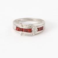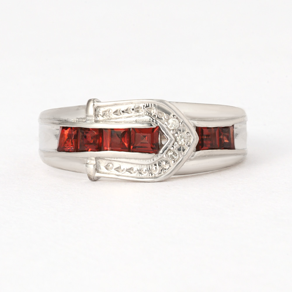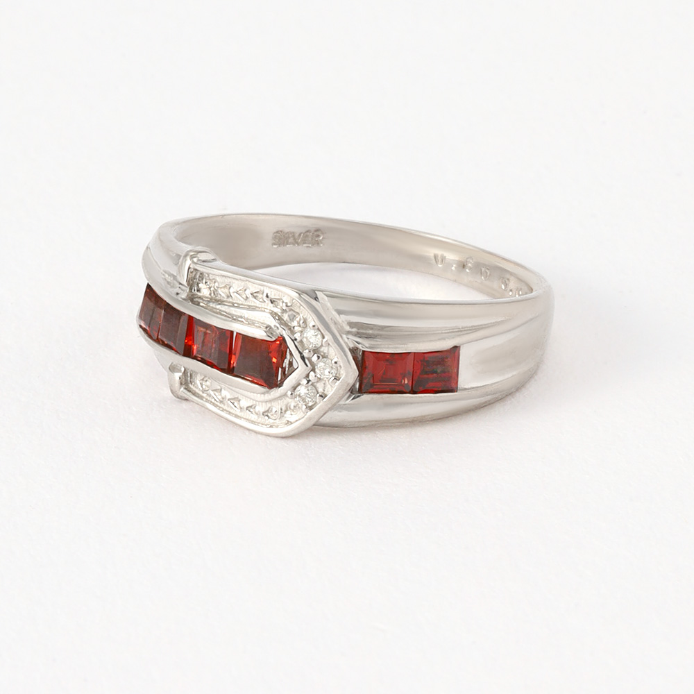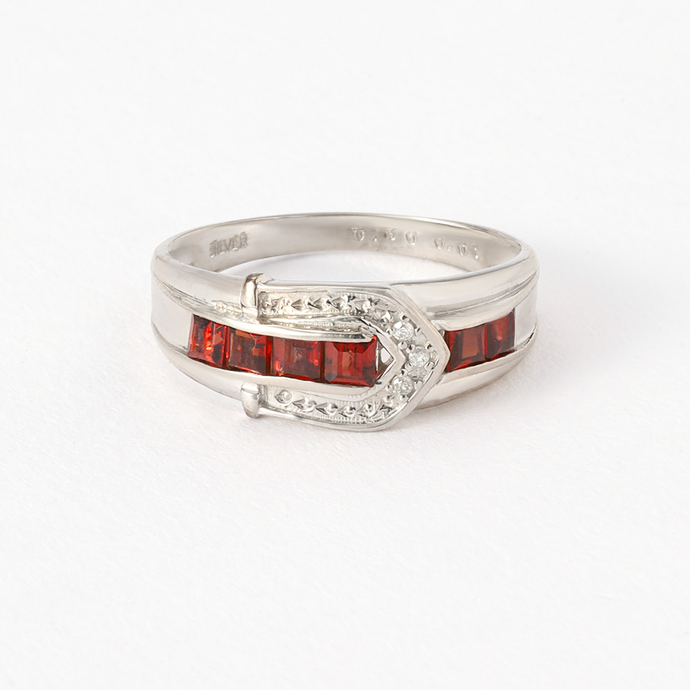 凛としたシルバーのラインで描かれた人気のベルトデザインに計6石(合計約0.6ct)のガーネットをセット。深く鮮やかな真紅の輝きが、指元にドラマティックな差し色を加えます。シャープなカッティングが施されたガーネットが放つ情熱的な赤と、クールなシルバーのコントラストが絶妙。バックル部分には3石のダイヤモンドがさりげない煌めきを添え、高級感をプラスします。
