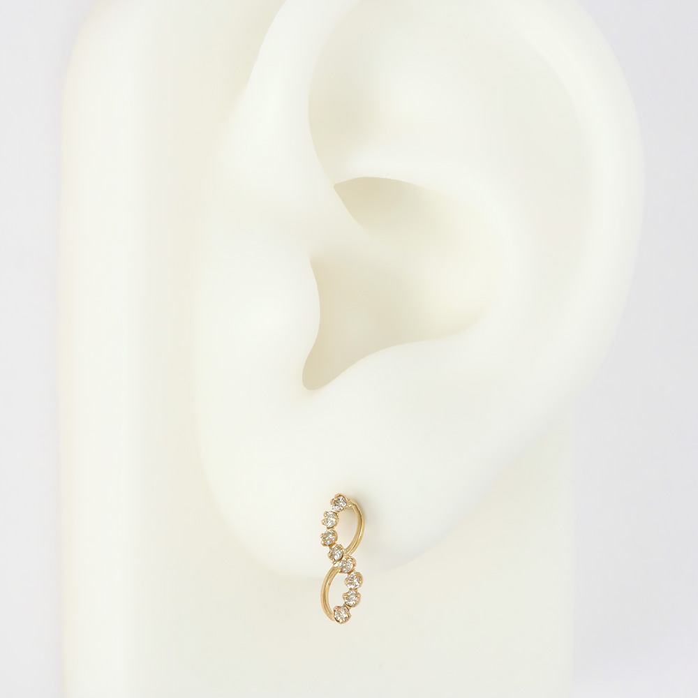 しなやかな曲線のインフィニティ18金ダイヤピアス。インフィニティモチーフには永遠の愛や永遠の強い絆などの意味が込められています。ダイヤとゴールドの途切れることのない永遠のループ曲線がエレガントなデザインです。