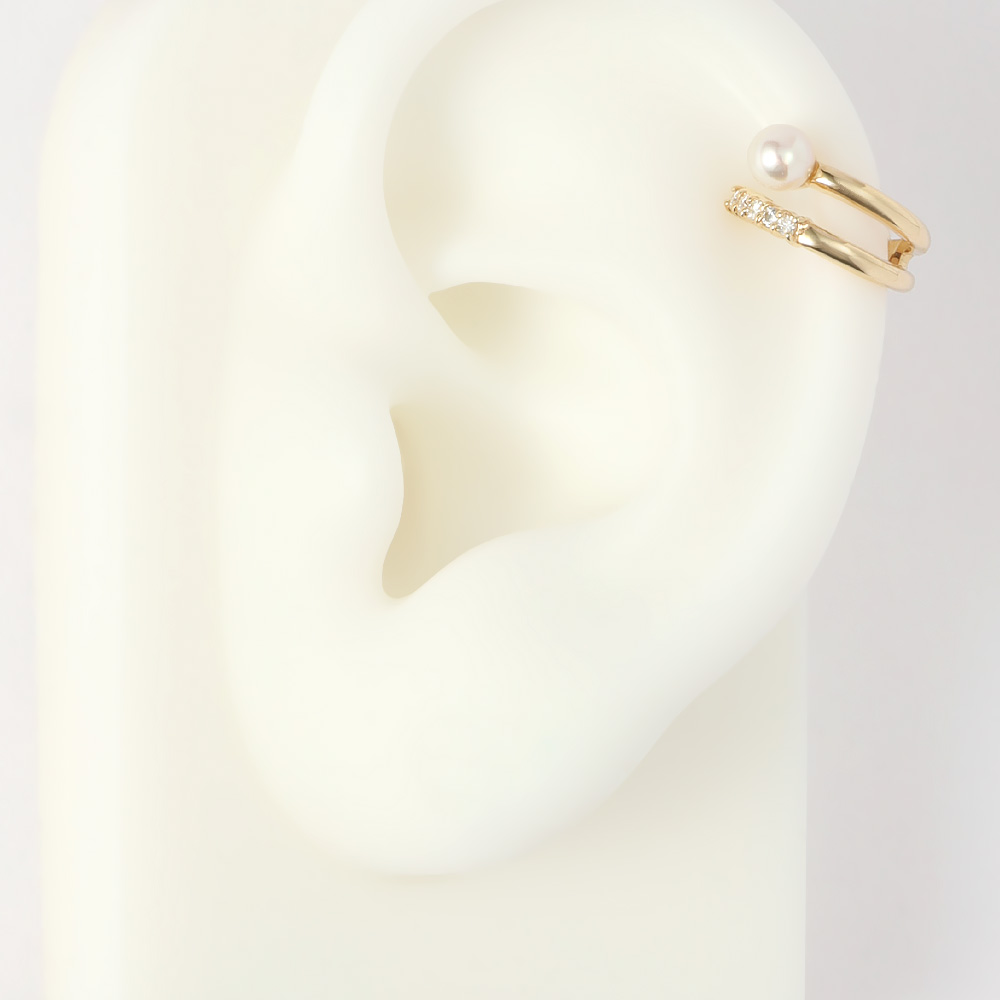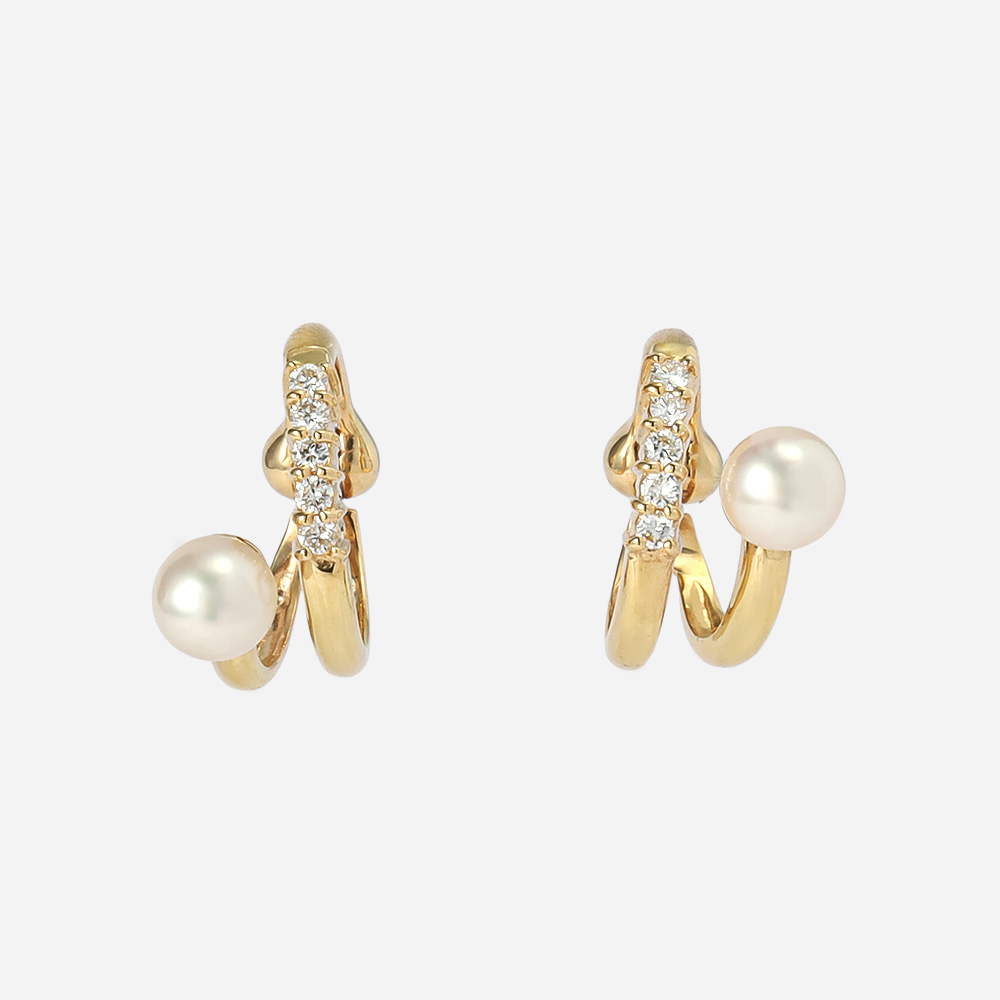 身に着けたときにダイヤフープピアスとパールピアスを重ね付けように見えるイヤリング。止め金は無段階で微調節が可能で、心地よくフィットします。おしゃれなイヤカフとしてもお使いいただけます。シンプルなデザインなので、あらゆる装いにさりげなく気品と華やかさをプラスします。