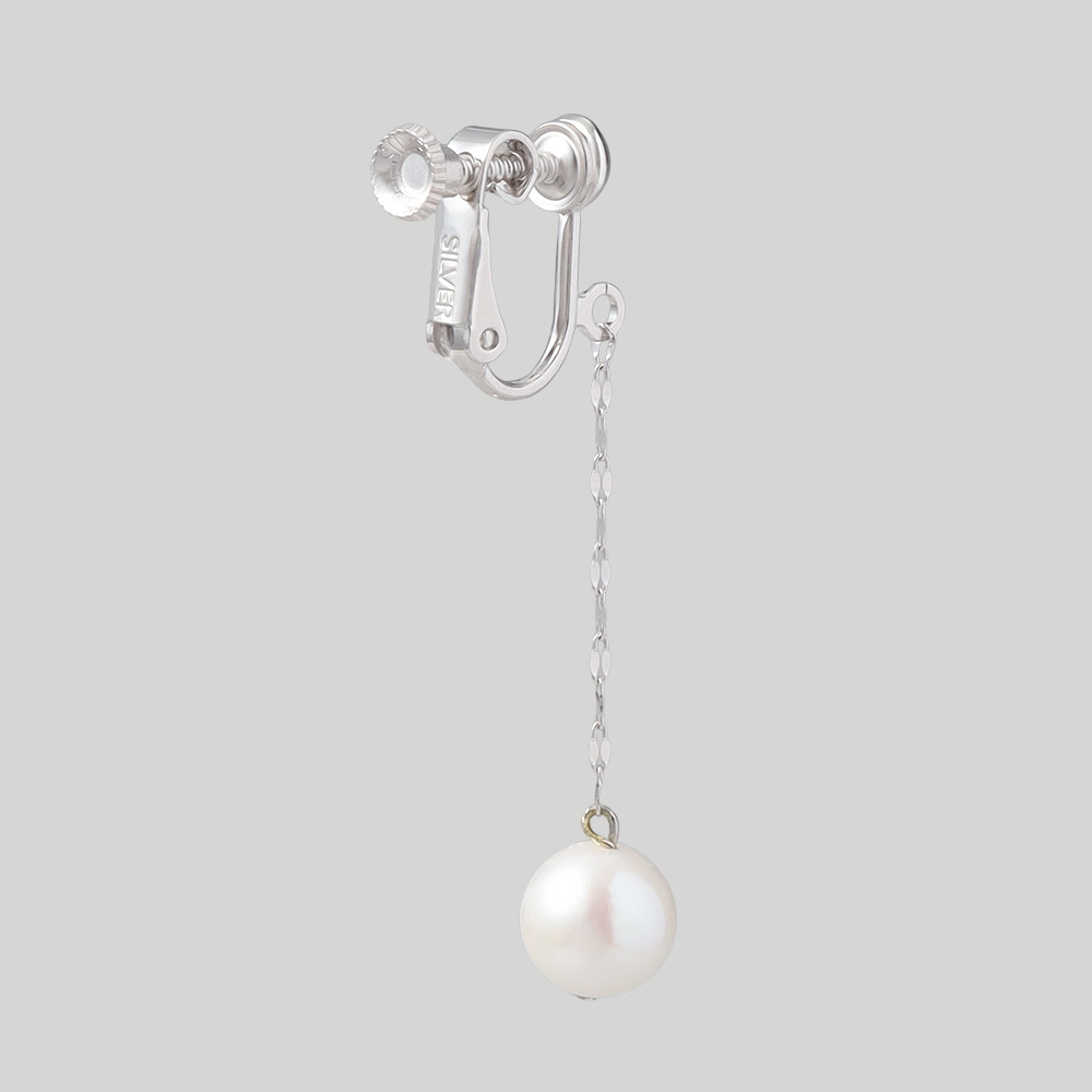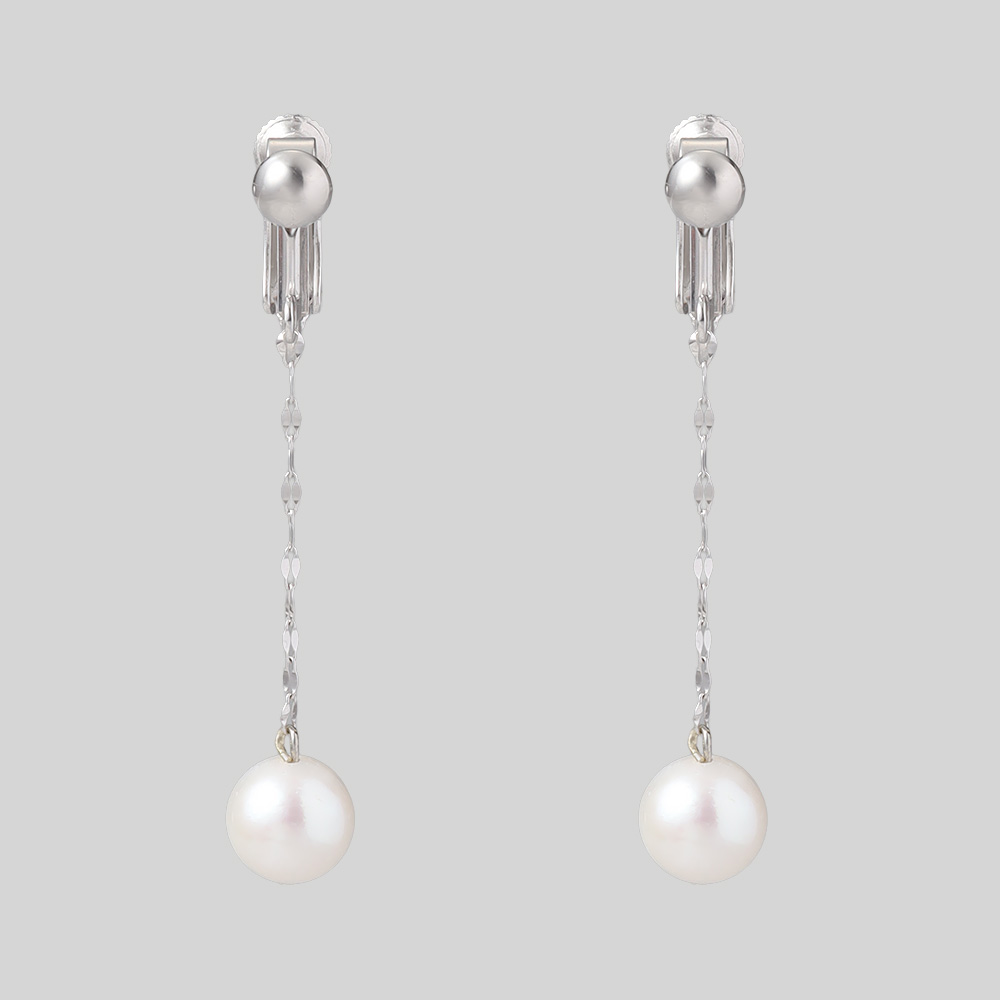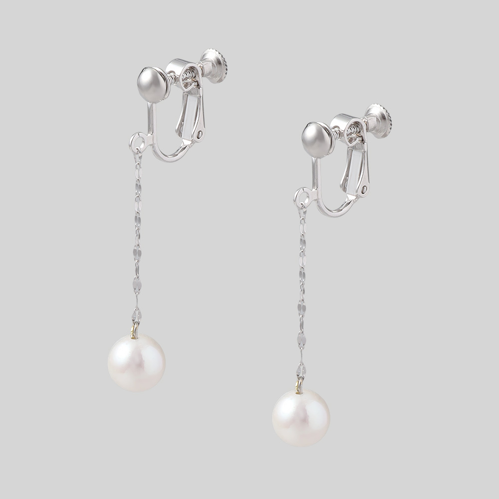 チェーンの先に付いたアコヤ真珠の8mm珠の揺れ動く様がチャーミングなイヤリング。どんな服装にも合わせやすいのも魅力です。