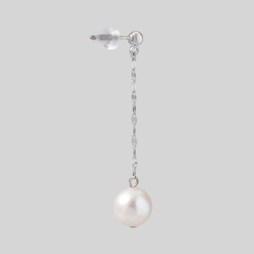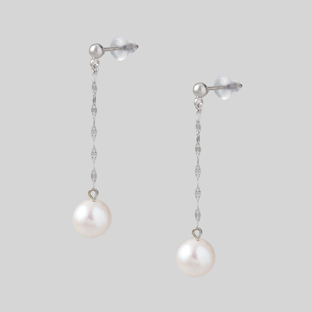 チェーンの先に付いたアコヤ真珠の8mm珠の揺れ動く様がチャーミングなピアス。どんな服装にも合わせやすいのも魅力です。