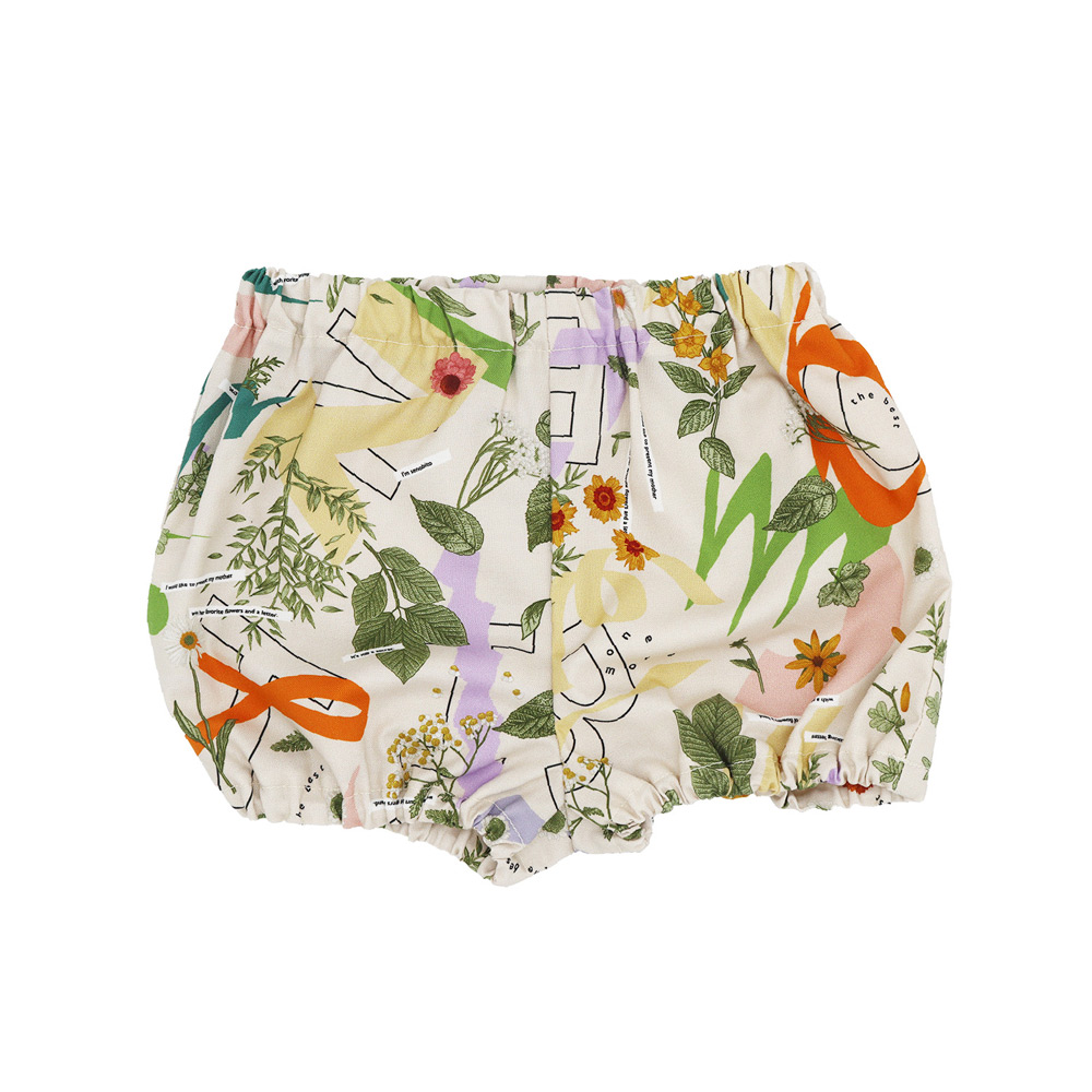 アシンメトリーな形が特徴のベビースタイと、おしりのオリジナルタグがポイントのベビーブルマのセット