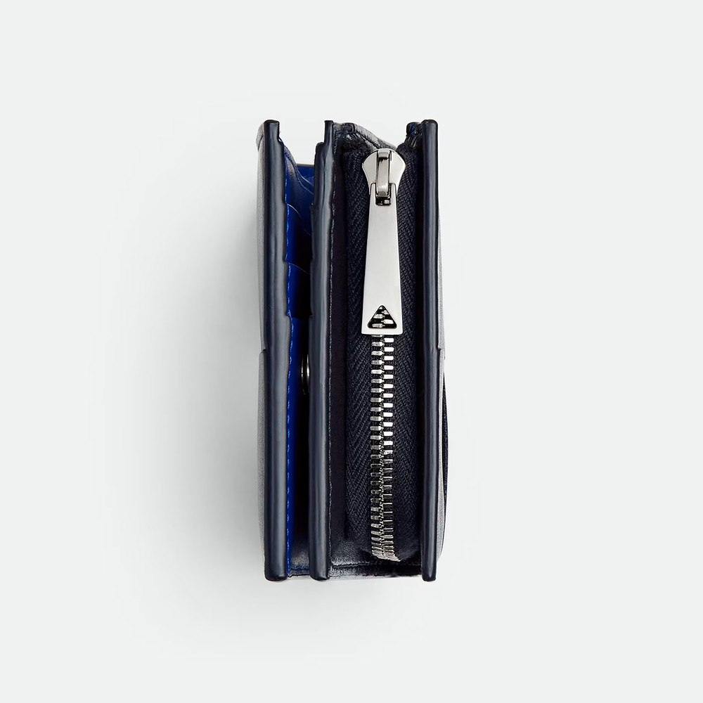 内側にコントラストカラーを配した、イントレチャートカーフレザーのファスナー付き二つ折りウォレットです。