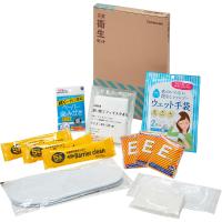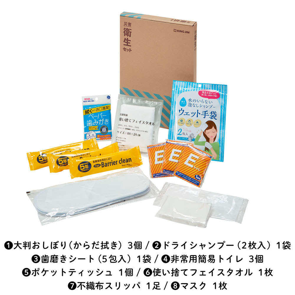 <セット内容>大判おしぼり(からだ拭き)×3個、ドライシャンプー(2枚入)×1袋、歯磨きシート(5包入)×1袋、非常用簡易トイレ(汚物収納袋+抗菌性凝固剤)×3個、ポケットティッシュ×1個、使い捨てフェイスタオル×1枚、不織布スリッパ×1足、マスク×1枚